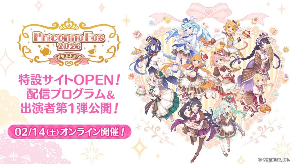 CygamesはアニメRPG『プリンセスコネクト!Re:Dive(プリコネR)』のオンラインイベント「プリコネフェス2026」を、2026年2月14日(土)15:00から公式YouTubeで配信します。あわせて描き下ろし衣装のキービジュアル(KV)と、番組プログラム概要、出演キャスト第1弾を公開しました。出演は阿部敦、M・A・O、伊藤美来、立花理香、近藤玲奈、大坪由佳、高尾奏音、鈴代紗弓の8人です。キャストは後日、第2弾の告知も予定しています。KVを使用した関連グッズはCyStoreで同日2月14日から販売予定で、アクリルスタンドやB2布ポスター、クリアファイルなどを先行提示しました。商品詳細は2026年1月下旬頃に案内する見通しです。さらにファンアートなどを募る「プリコネフェス2026アート投稿キャンペーン」を実施し、応募期間は2026年1月23日12:00~2月10日23:59で、作品が配信内で紹介される可能性があります。今後は番組内容や追加出演者、グッズの価格・仕様などの具体情報が順次更新される予定です。【イベント情報】