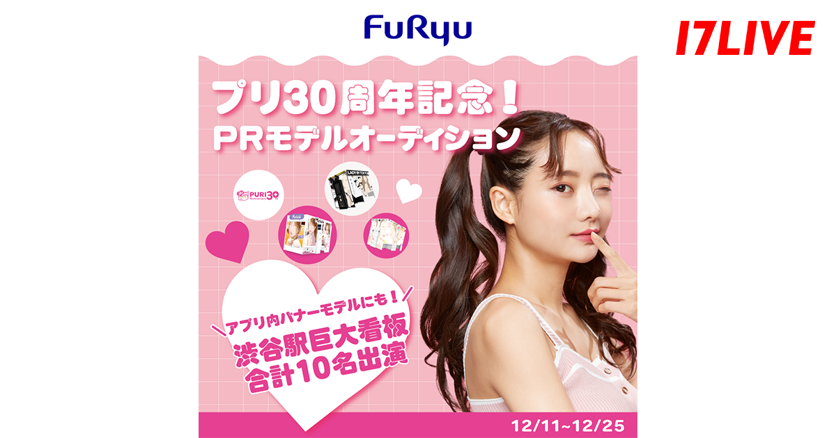 プリントシール機誕生30周年を記念し、ライブ配信アプリ「17LIVE」は12月11日15時から25日23時59分まで、渋谷駅の巨大看板などに登場するPRモデル10人を選ぶオンラインオーディション「プリ30周年記念!PRモデルオーディション」を実施します。対象は「17LIVE」で活動する18歳以上35歳以下の女性ライバーで、上位入賞者と審査通過者の計10人が選出されます。