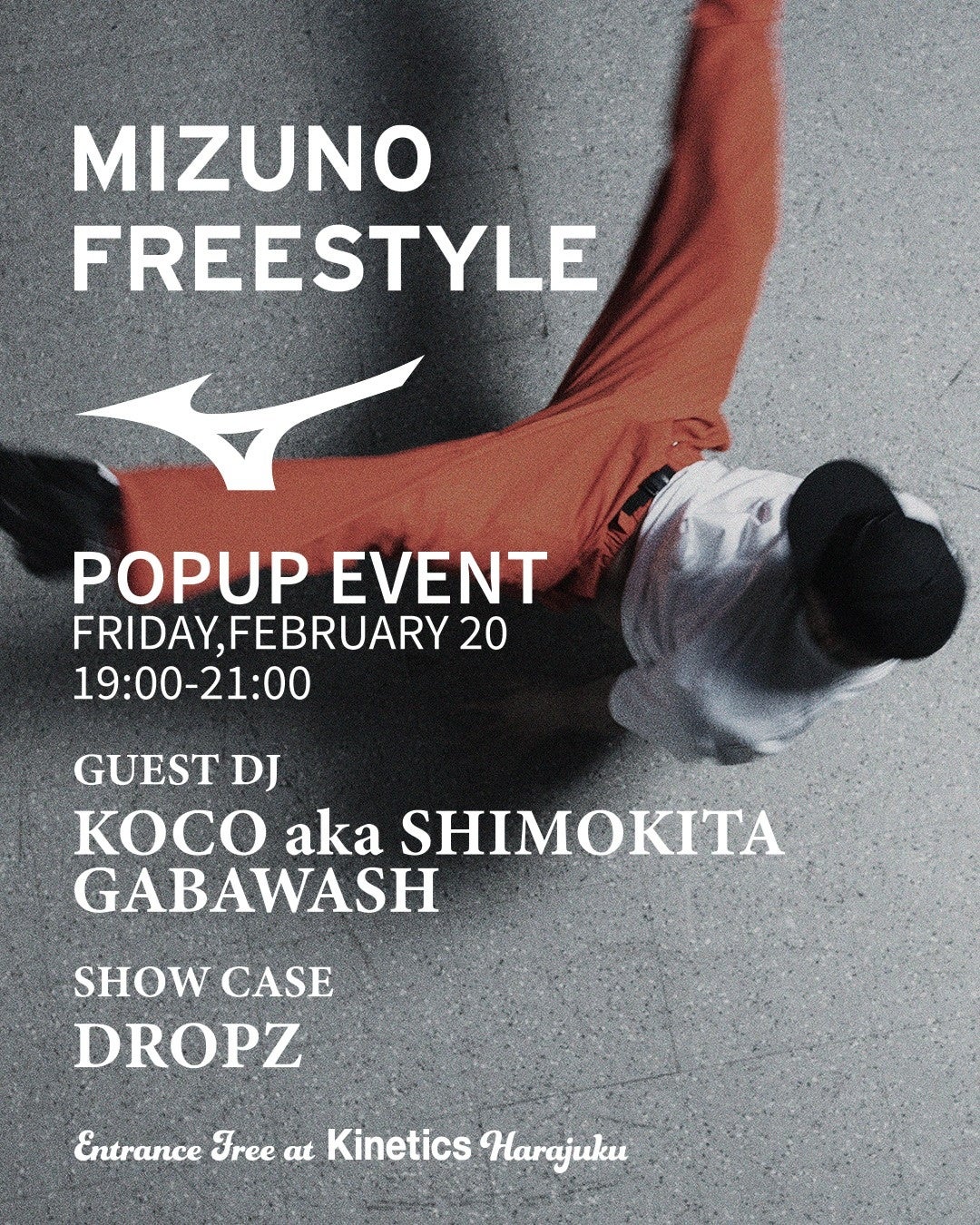 MIZUNO FREESTYLE POPUP EVENT:2026年2月20日(金)19:00〜21:00(最終入場 20:30)/会場:Kinetics 原宿(〒150-0001 東京都渋谷区神宮前1丁目12−7 神宮前藤木ビル)