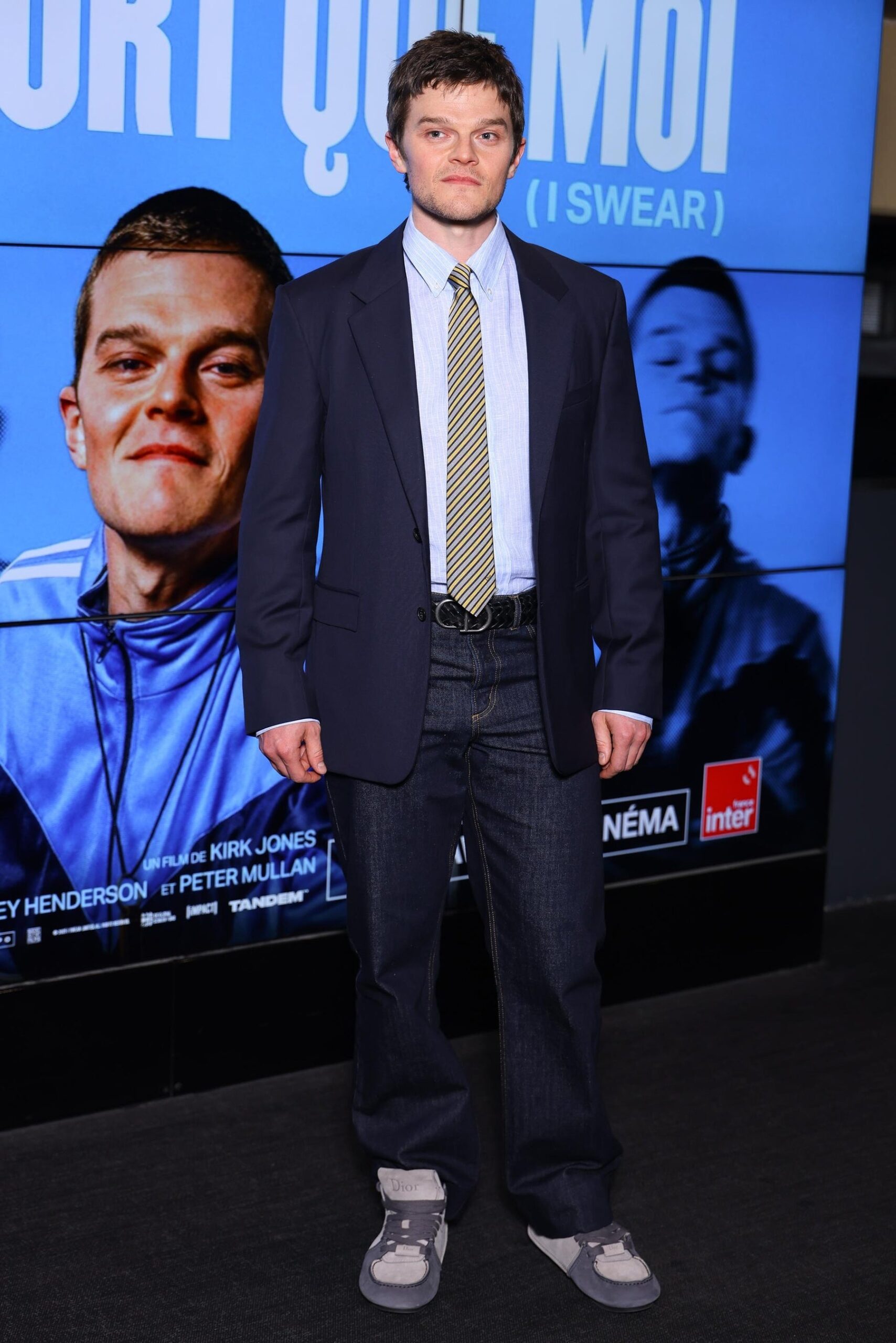 小物は、イエローとグレーのシルクストライプタイを合わせ、足元にはグレーの「ディオール ローディー」シューズを着用しました。映画のプレミアという場に合わせ、ジャケットとデニムを組み合わせたスマートカジュアル寄りのコーディネートとして整理できます。