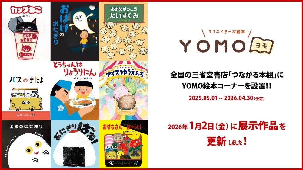 絵本通販サイト「YOMO」を運営するニコモは、三省堂書店のオリジナル書棚「つながる本棚」内「YOMO絵本コーナー」の設置絵本を2026年1月から入れ替え、1月は新規5作品を加え計9作品を展開します。対象は全国の三省堂書店(一部店舗を除く)です。