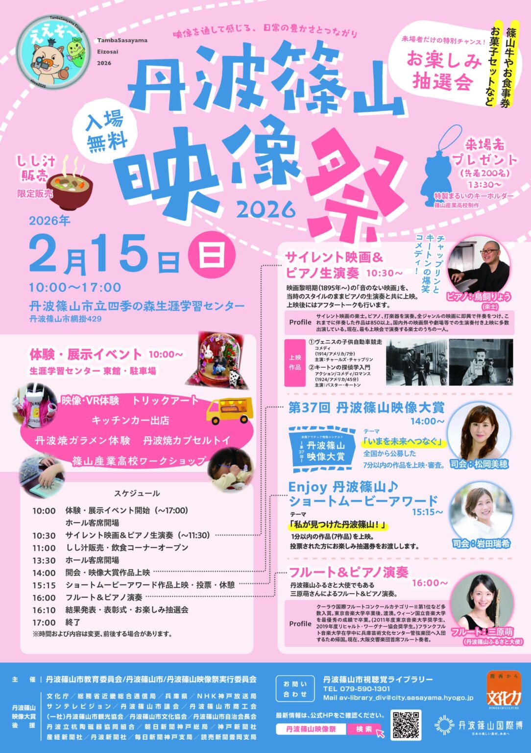 当日は午前に、VR技術を使った映像体験のほか、丹波焼コーナーやしし汁販売などの体験・展示、飲食企画を実施します。午後はホールで開会後、作品上映に加えてショートムービーアワードの上映と投票、演奏、結果発表・授賞式、お楽しみ抽選会を予定しています。