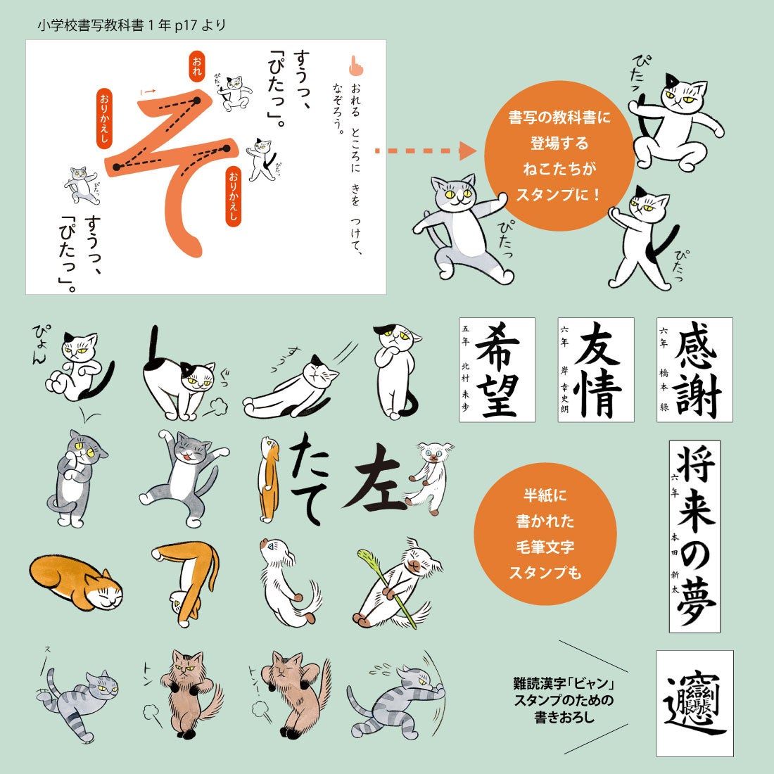 スタンプは、書写で習う筆使いを猫のキャラクターで表現し、毛筆文字も組み合わせた内容です。イラストは石黒亜矢子さんが担当し、日常会話で使える表現をスタンプ化しました。