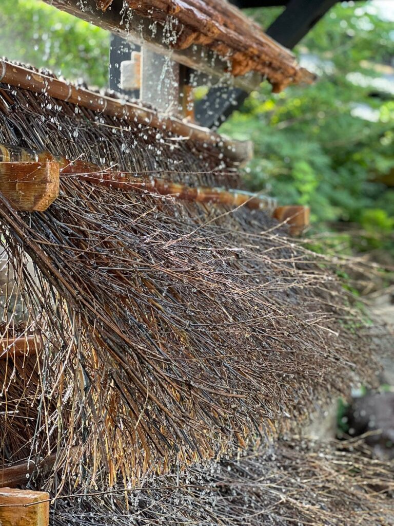 湯雨竹は、高温の源泉を竹に通して細かく分散させ、「湯の雨」のように空気に触れさせながら温度を下げる仕組みです。一般的に温泉は加水して適温にするケースが多い中、加水なしでの温度調整を行う技術として説明されています。