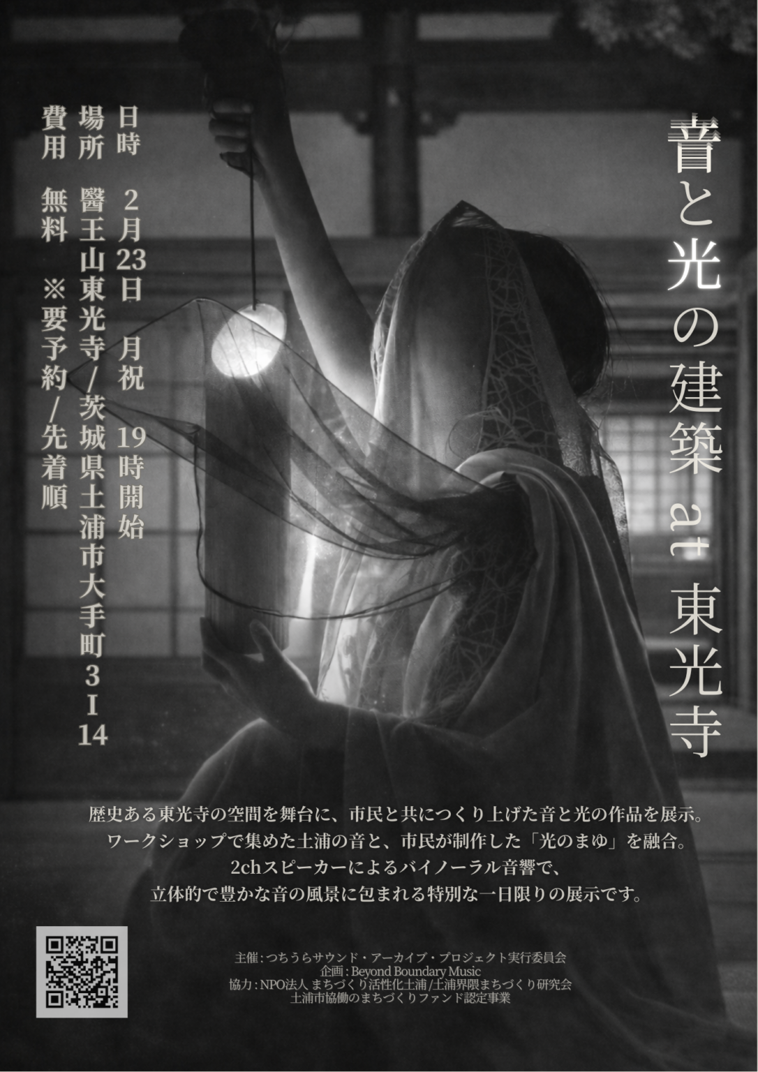 茨城県土浦市のつちうらサウンド・アーカイブ・プロジェクト実行委員会は2月23日(月・祝)19時から、醫王山東光寺(同市大手町3-14)でサウンドインスタレーション・イベント「音と光の建築 at 東光寺」を開きます。入場は無料で、予約制の先着順です。