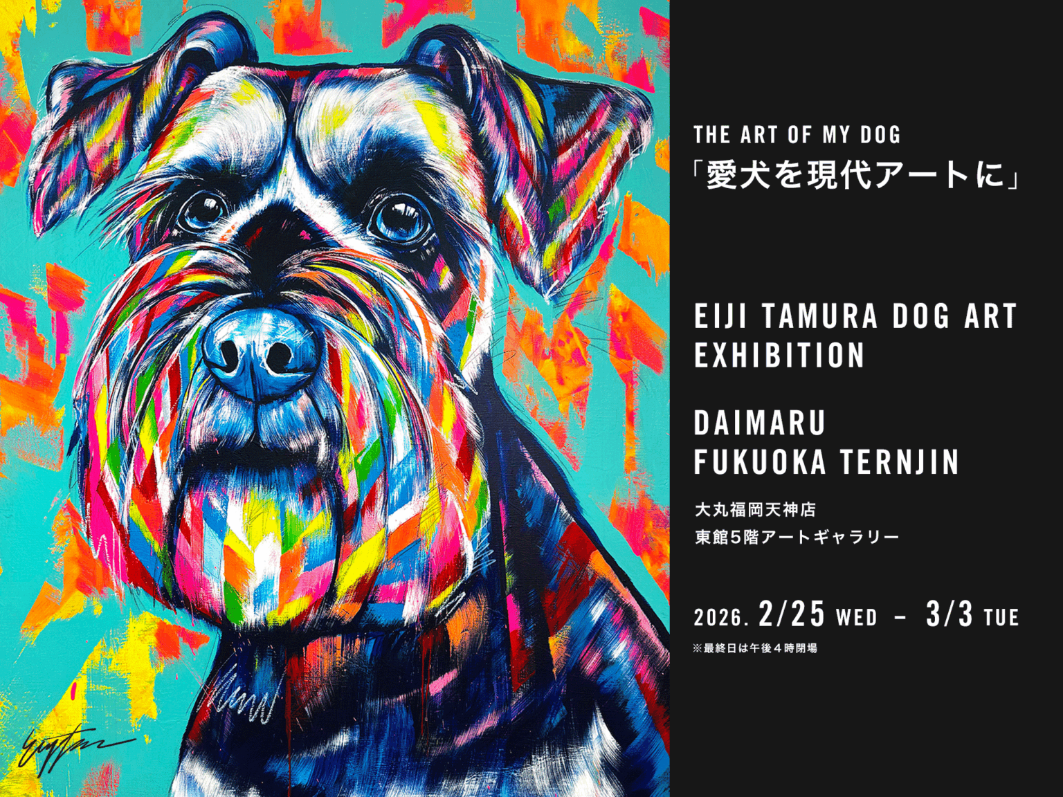 大丸福岡天神店(福岡市中央区)の東館5階アートギャラリーで2026年2月25日~3月3日、愛犬をカラフルな現代アートとしてオーダーできる展示「EIJI TAMURA DOG ART EXHIBITION」が開かれます。営業時間は10:00~20:00で、最終日は16:00閉場です。