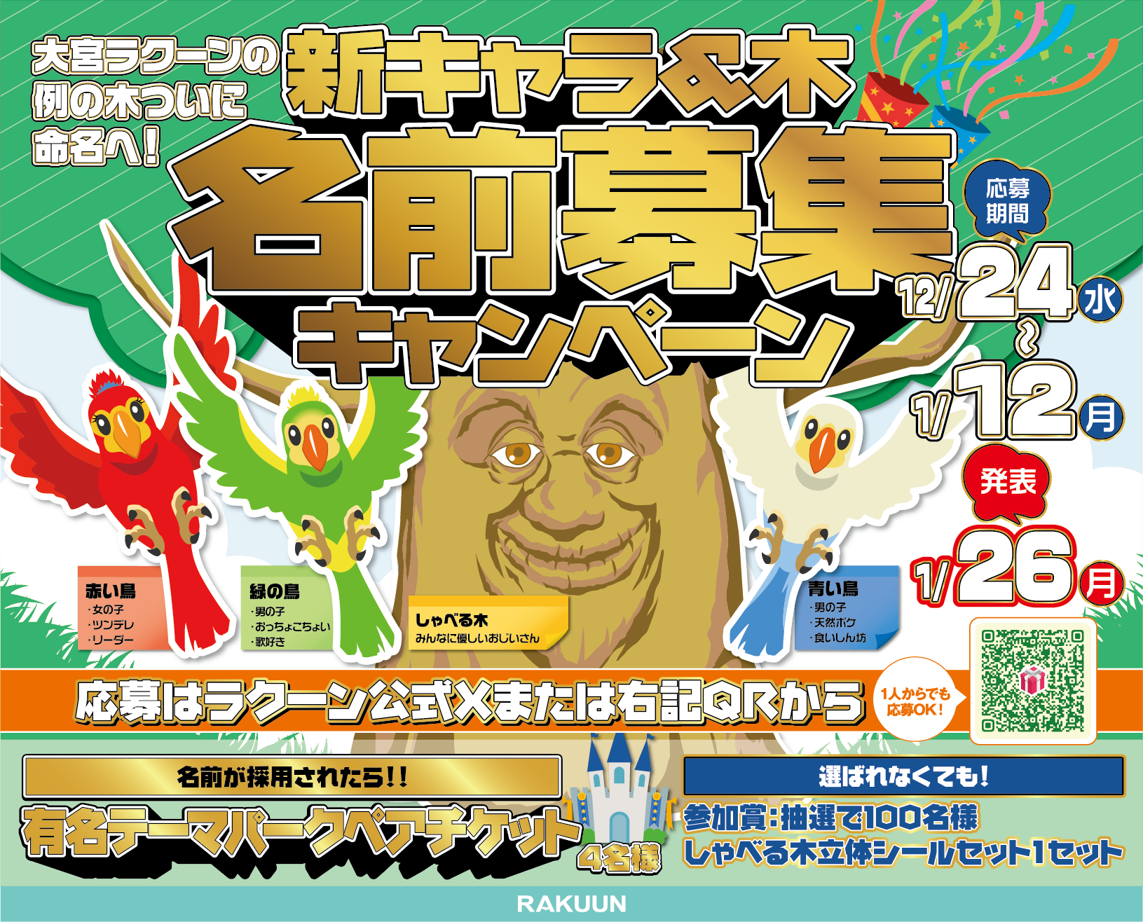 大宮ラクーン(埼玉県さいたま市)の3階マスコット「しゃべる木」が12月24日にリニューアルし、赤・青・緑の鳥3羽が新たに加わりました。4キャラクターはいずれも名称未決定で、施設は名前募集キャンペーンを開始しています。応募締切は2026年1月12日23:59、結果発表は同1月26日予定です。応募はGoogleフォームまたは公式X(@OomiyaRakuun)で受け付け、採用者にはキャラクターごとに名付け親として「有名テーマパーク」ペアチケットを進呈(最大4人)。不採用者も含め抽選100人にオリジナルの「ぷくぷくシール」を用意します。4人の掛け合いは毎日9時から1時間おきに行われ、回ごとに話題が変わるとしています。今後は新名称の浸透と来館動機づくりが焦点になりそうです。
