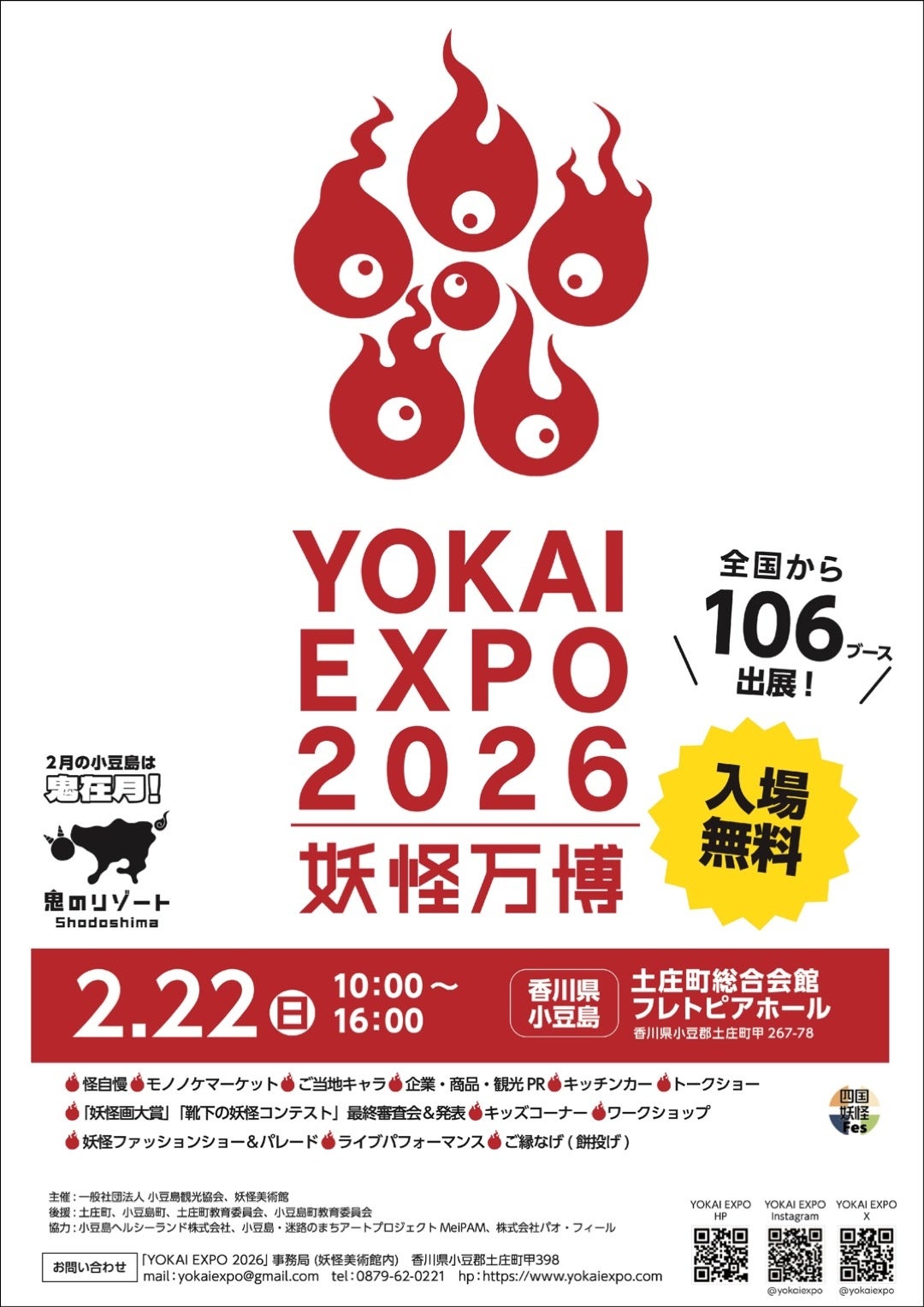 香川県小豆島の土庄町総合会館フレトピアホールで2026年2月22日10時〜16時、「YOKAI EXPO 2026」が開かれます。入場は無料で、来場は3,500人を見込んでいます。主催は一般社団法人小豆島観光協会と妖怪美術館です。