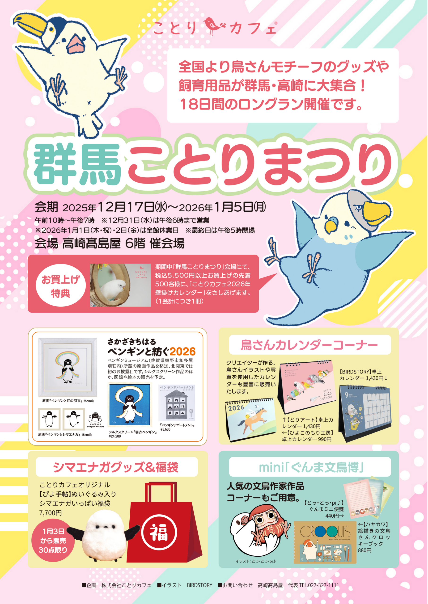 群馬県高崎市の高崎髙島屋6階催会場で、鳥モチーフの雑貨やアートを集めた「群馬ことりまつり」が2025年12月17日から2026年1月5日までの18日間開催されます。会期中は全国の人気クリエイター作品やメーカー商品を販売し、実演コーナーは日替わりでクリエイターが常駐します。企画展では、イラストレーターさかざきちはるの「ペンギンと紡ぐ2026」を実施し、佐賀県嬉野市のペンギンミュージアム所蔵の原画を北関東で初公開します。関連商品として図録、ポストカード、シルクスクリーン2点なども販売予定です。1月3日からはシマエナガ福袋を30点限定で販売します。年末は12月31日が午後6時まで、2026年1月1日・2日は全館休業、最終日は午後5時閉場で、混雑状況によっては入場や購入に影響が出る可能性があります。