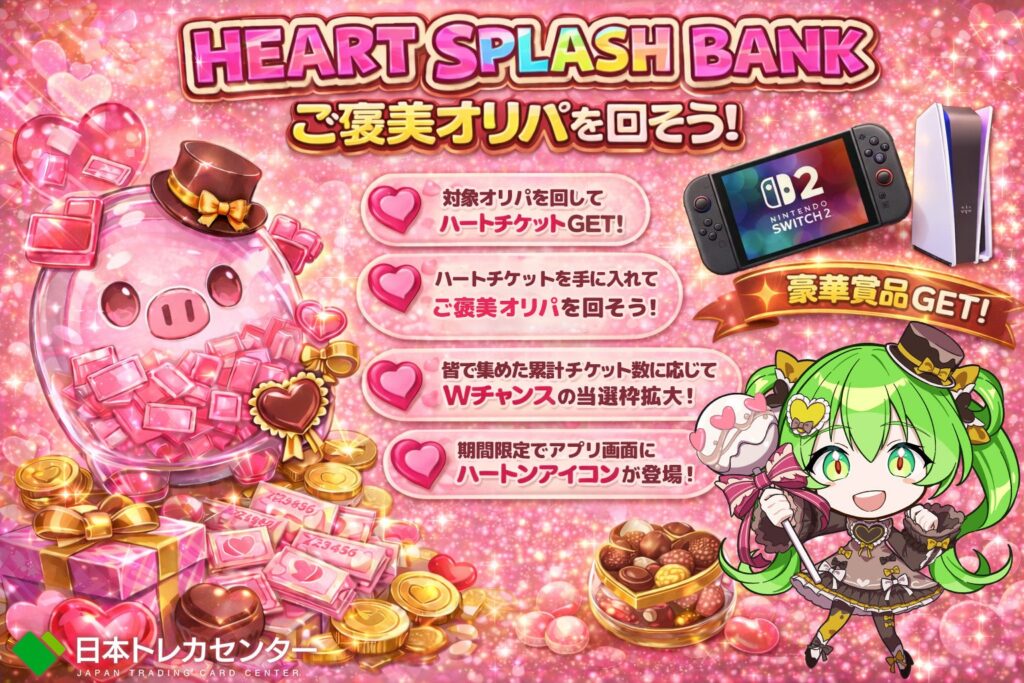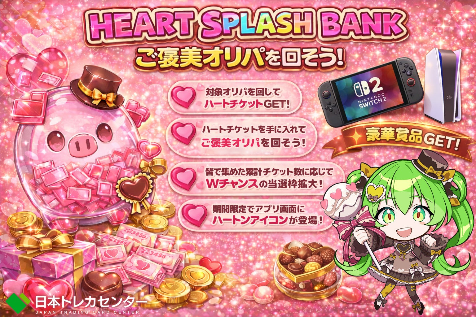日本トレカセンターは、オンラインでユーザー参加型バレンタインイベント「HEART SPLASH BANK」を2026年2月9日15時から2月25日14時59分まで実施します。集めた「ハートチケット」で「ご褒美オリパ」を回せるほか、全ユーザーの使用チケット累計に応じて「Wチャンス」の景品総額が200万円相当、500万円相当、最大1,000万円相当へ段階的に拡大します。