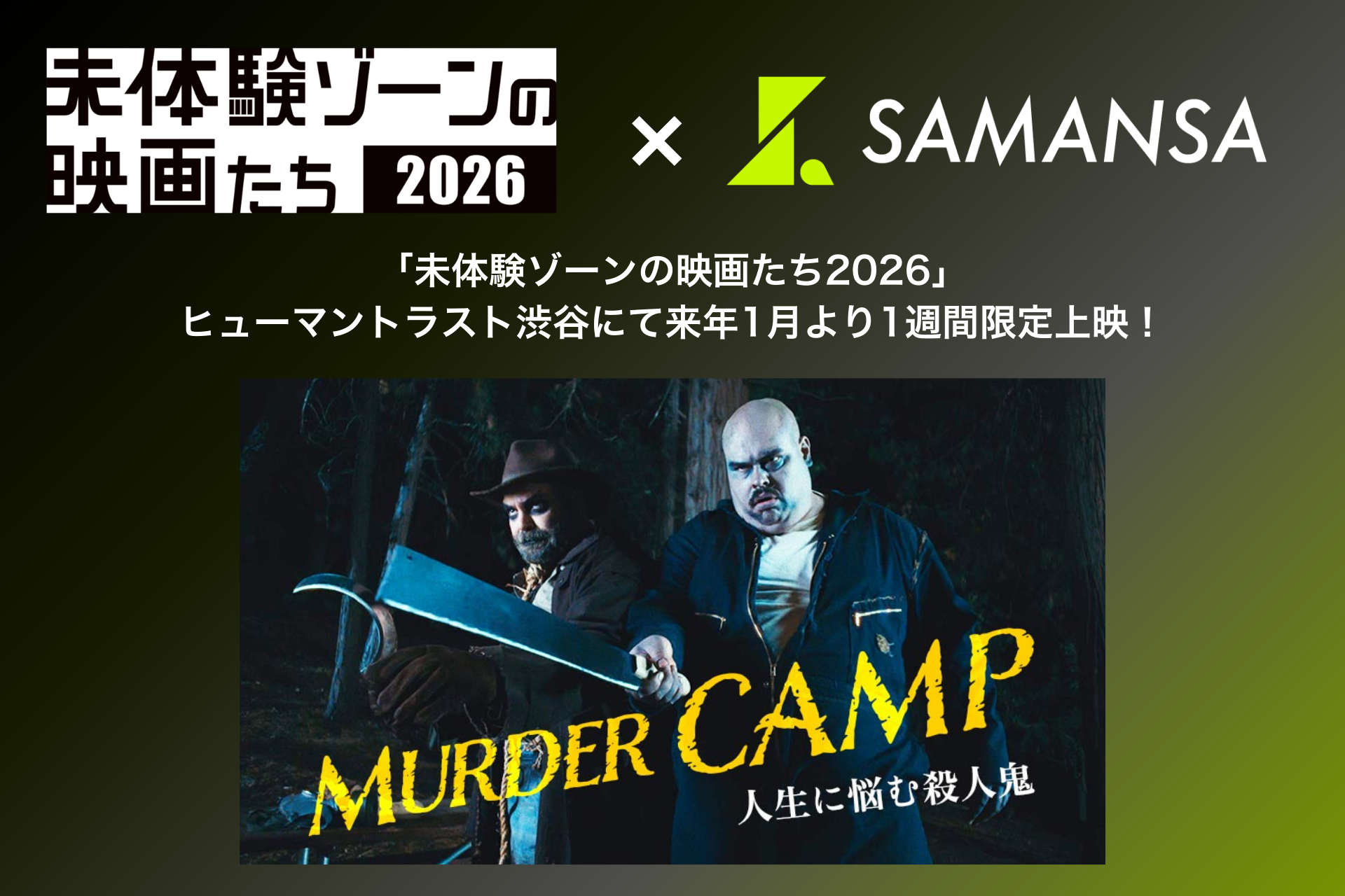 ショート映画配信のSAMANSAは、ヒューマントラストシネマ渋谷で開催される映画祭「未体験ゾーンの映画たち2026」で、短編『マーダー・キャンプ(原題:Murder Camp)』を2026年1月16日から22日までの1週間限定で上映します。上映時間は15分で、鑑賞料金はSAMANSA作品として1,000円均一です。来場者には配信サービス「SAMANSA」を1カ月無料で使えるクーポンも配布し、数量限定でなくなり次第終了します。