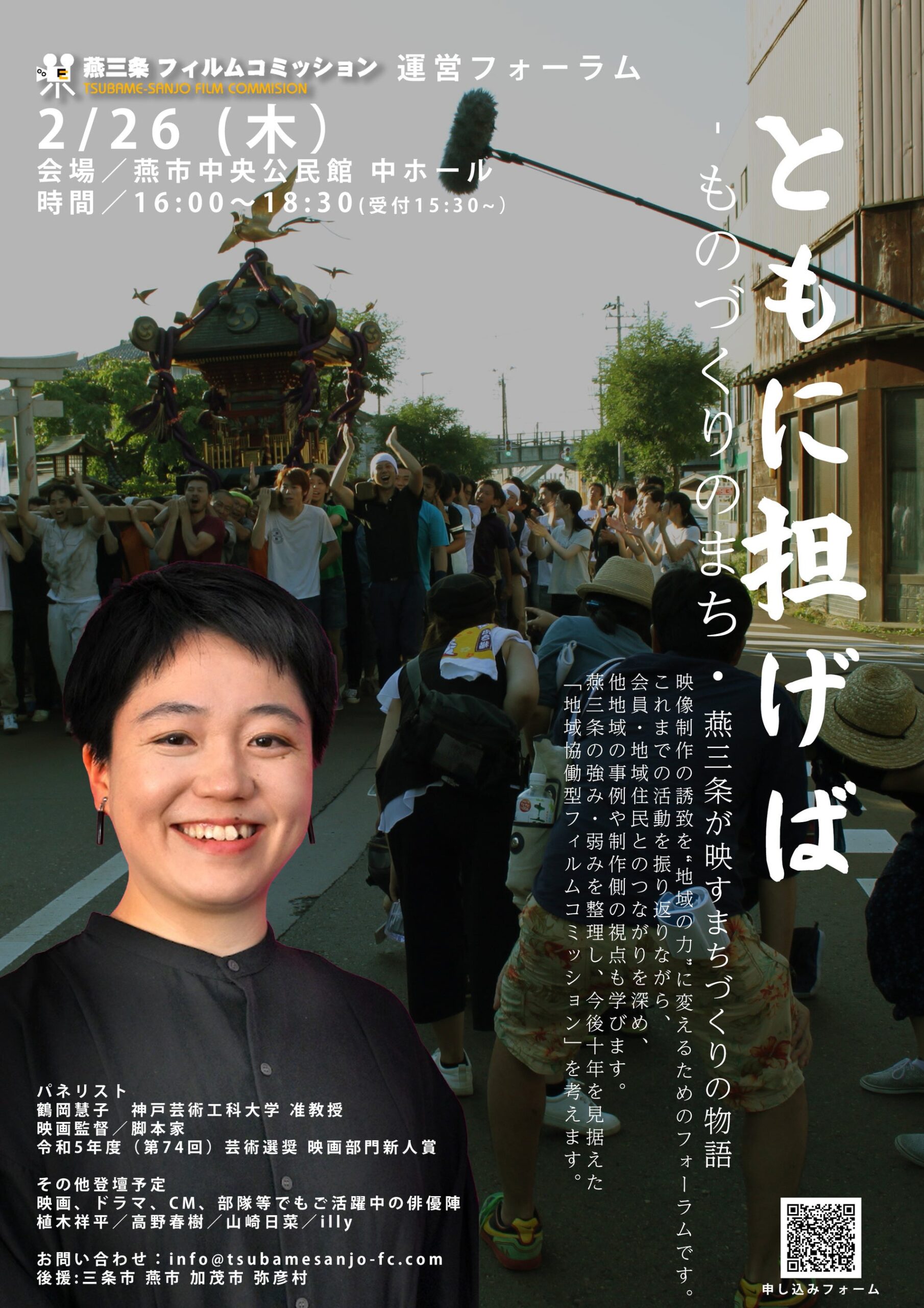 燕三条フィルムコミッションは2月26日16時から、燕市中央公民館 中ホールで運営フォーラム「ともに担げば ― ものづくりのまち・燕三条が映すまちづくりの物語 ―」を開きます。定員は約100人で、申込フォームで受け付けます。