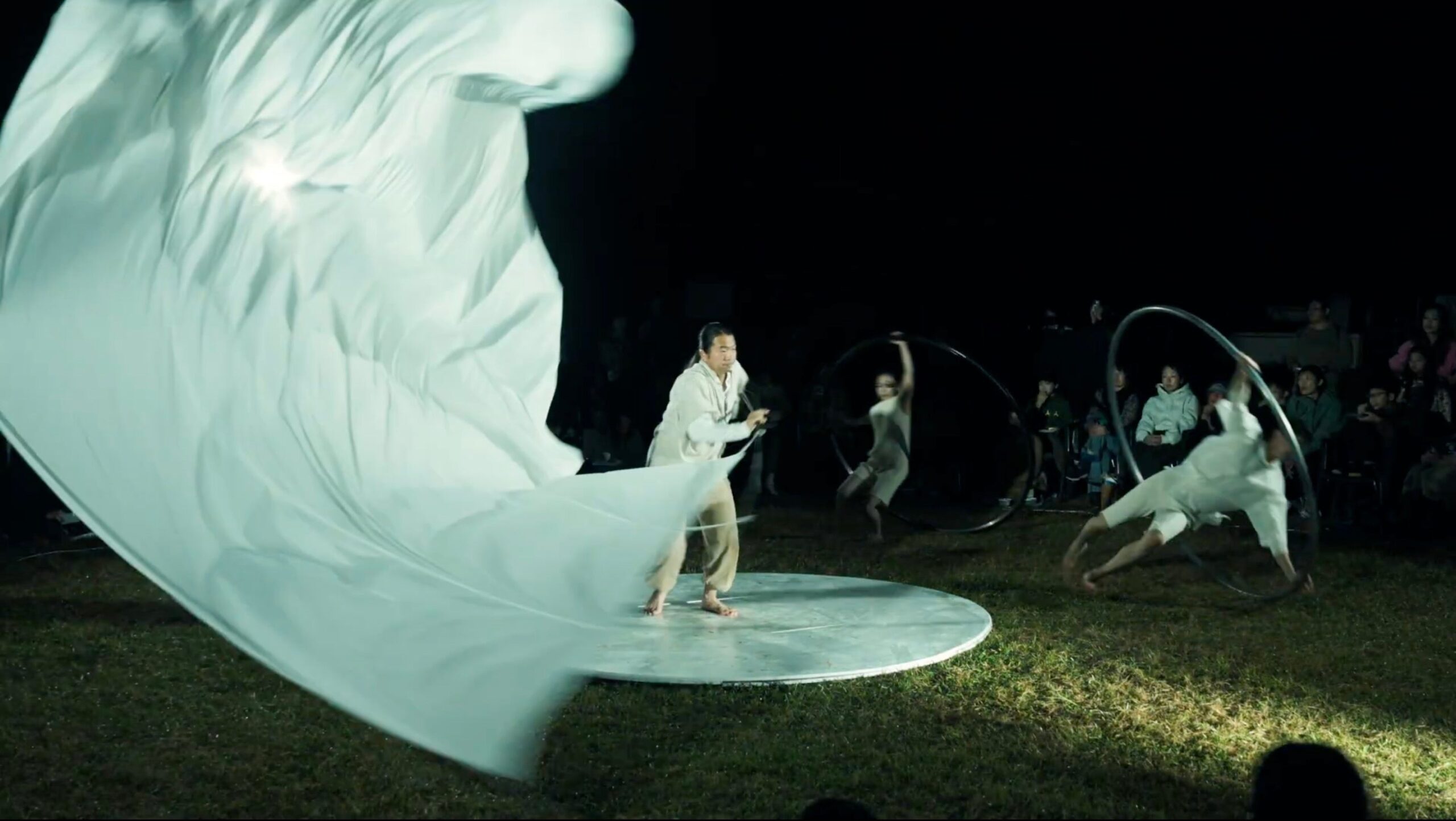 同カンパニーはサーカスアーティストの谷口界さんと大旗遣いの麻風さんを中心に2025年に結成され、野瀬山瑞希さんが出演しました。鉄の輪「シルホイール」や大旗、石材の庵治石(あじいし)を用いた身体表現で、「重力と浮遊のあいだ」をテーマに、風や光、石といった自然要素と呼応する演出を組み立てたとしています。