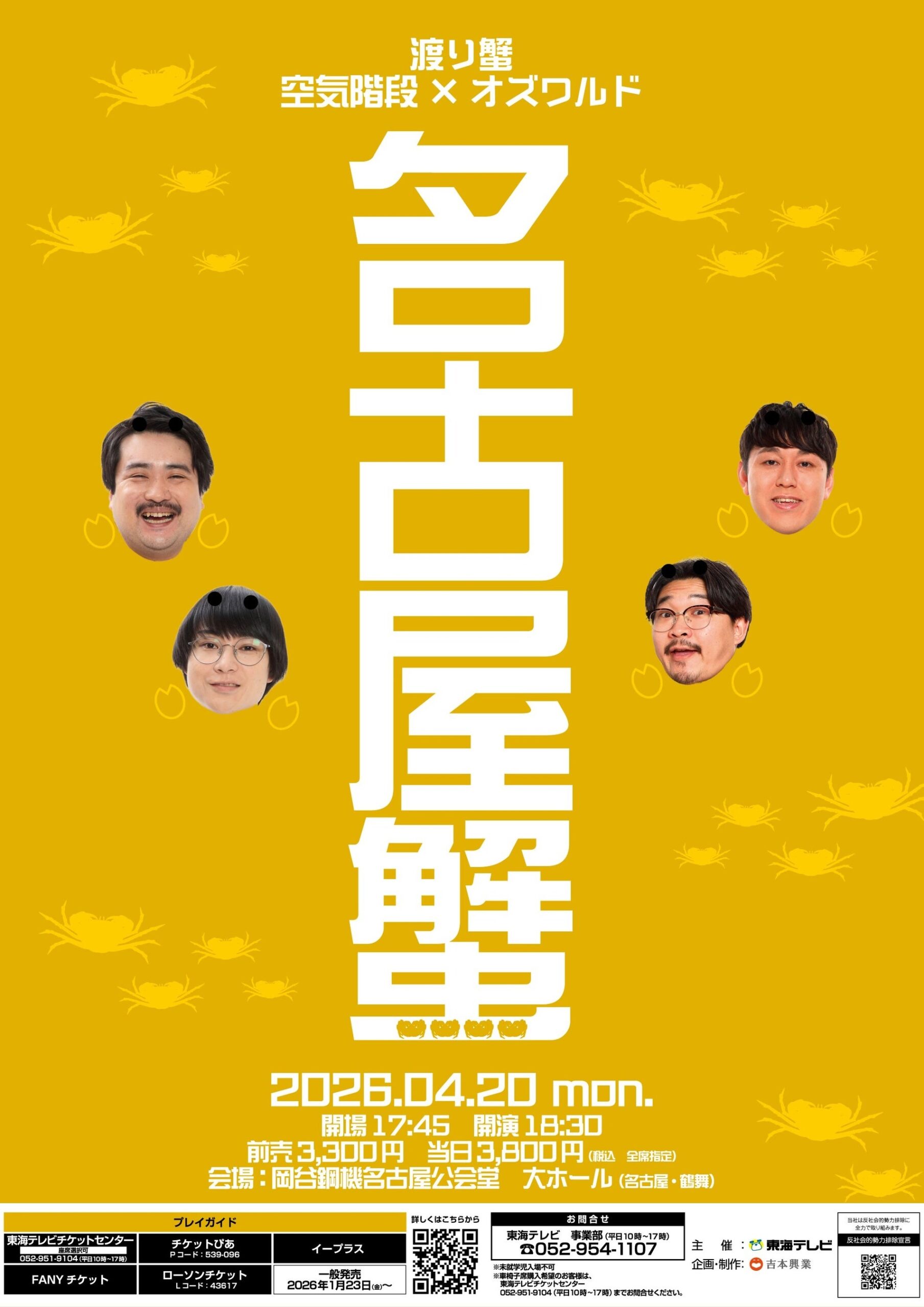 お笑いコンビの空気階段とオズワルドによるユニットライブ「名古屋蟹2026」が2026年4月20日、岡谷鋼機名古屋公会堂(名古屋市昭和区)で開かれます。18時30分開演(17時45分開場)で、前売3300円、当日3800円です。未就学児は入場できません。