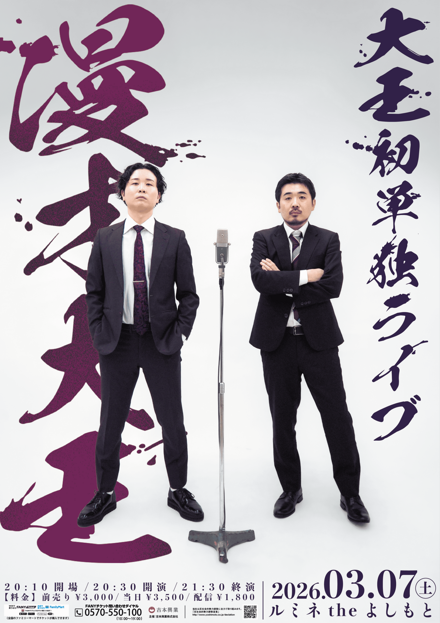 結成1年目のお笑いコンビ「大王」(渡辺ポット、山内仁平)は、ルミネtheよしもとで初単独ライブ「漫才大王」を2026年3月7日(土)に開催します。開場は20時10分、開演は20時30分で、前売3,000円、当日3,500円、配信は1,800円です。