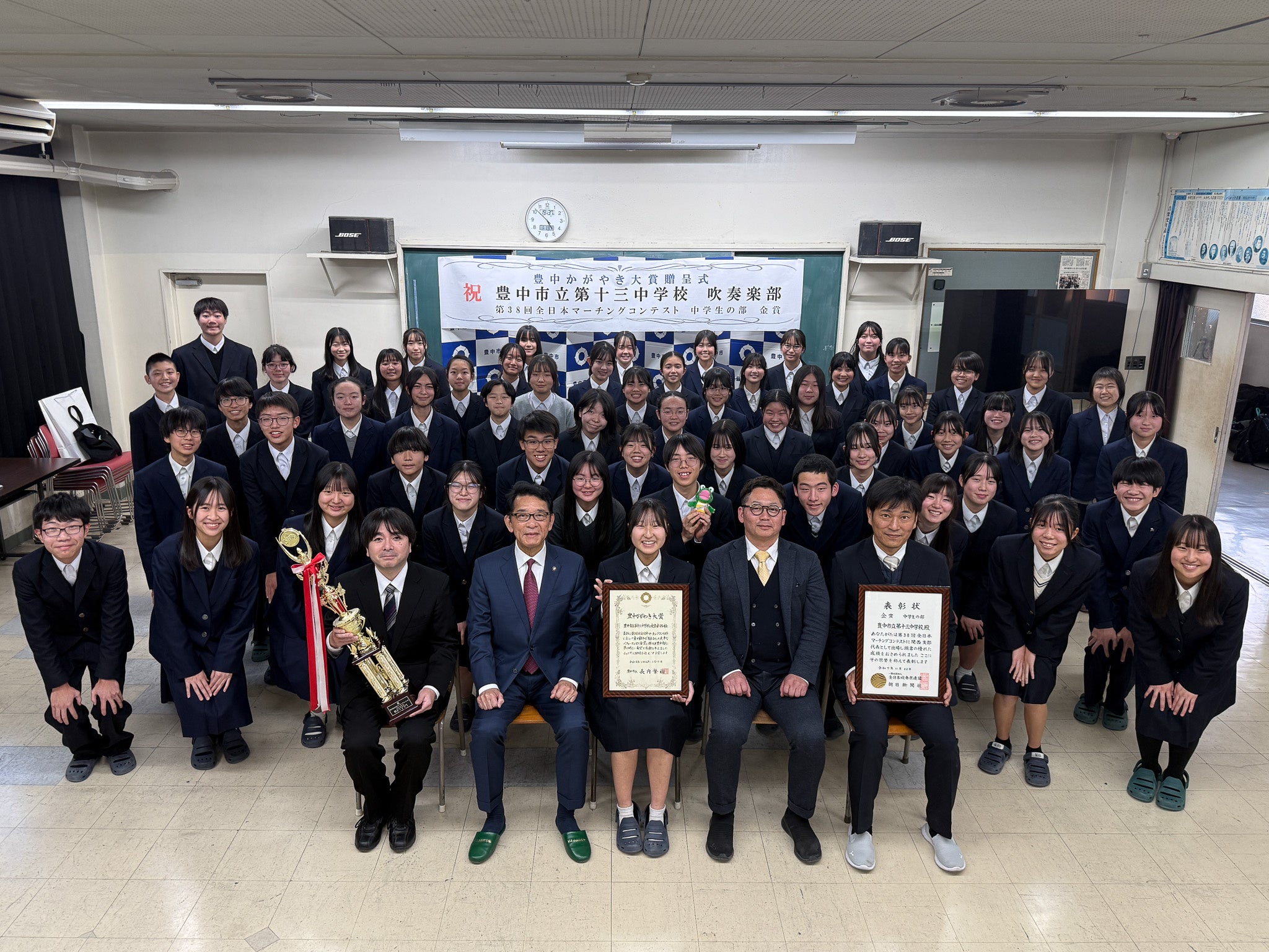 豊中市立第十三中学校吹奏楽部は、2025年11月22日に大阪城ホールで開かれた「第38回全日本マーチングコンテスト」中学生の部で金賞を受賞しました。関西代表として出場し、全国大会で最高評価を得た形です。豊中市はこの成績を受け、同部に市の表彰制度「豊中かがやき大賞」を贈呈します。贈呈は2026年1月13日16時30分から17時まで、同校4階の音視室(大阪府豊中市柴原町2-14-1)で行われ、長内繁樹市長が手渡す予定です。豊中かがやき大賞は、日本や世界規模の大会などで顕著な活躍をし、市民に夢や希望、感動を与えた個人・団体をたたえる制度です。市は今回の受賞を地域の文化活動の成果として位置づけ、今後も学校部活動の取り組みを後押ししていくとみられます。
