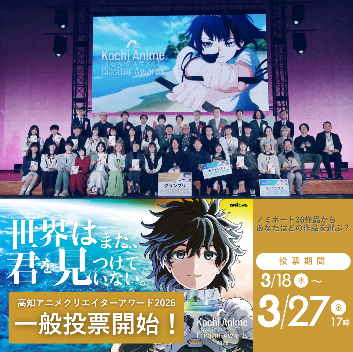 高知アニメクリエイターアワード2026で、応募310作品から審査を経てノミネート36作品が決まった。オーディエンス賞の一般投票は3月18日から3月27日17時まで、公式ウェブサイトの投票ページで受け付ける。
