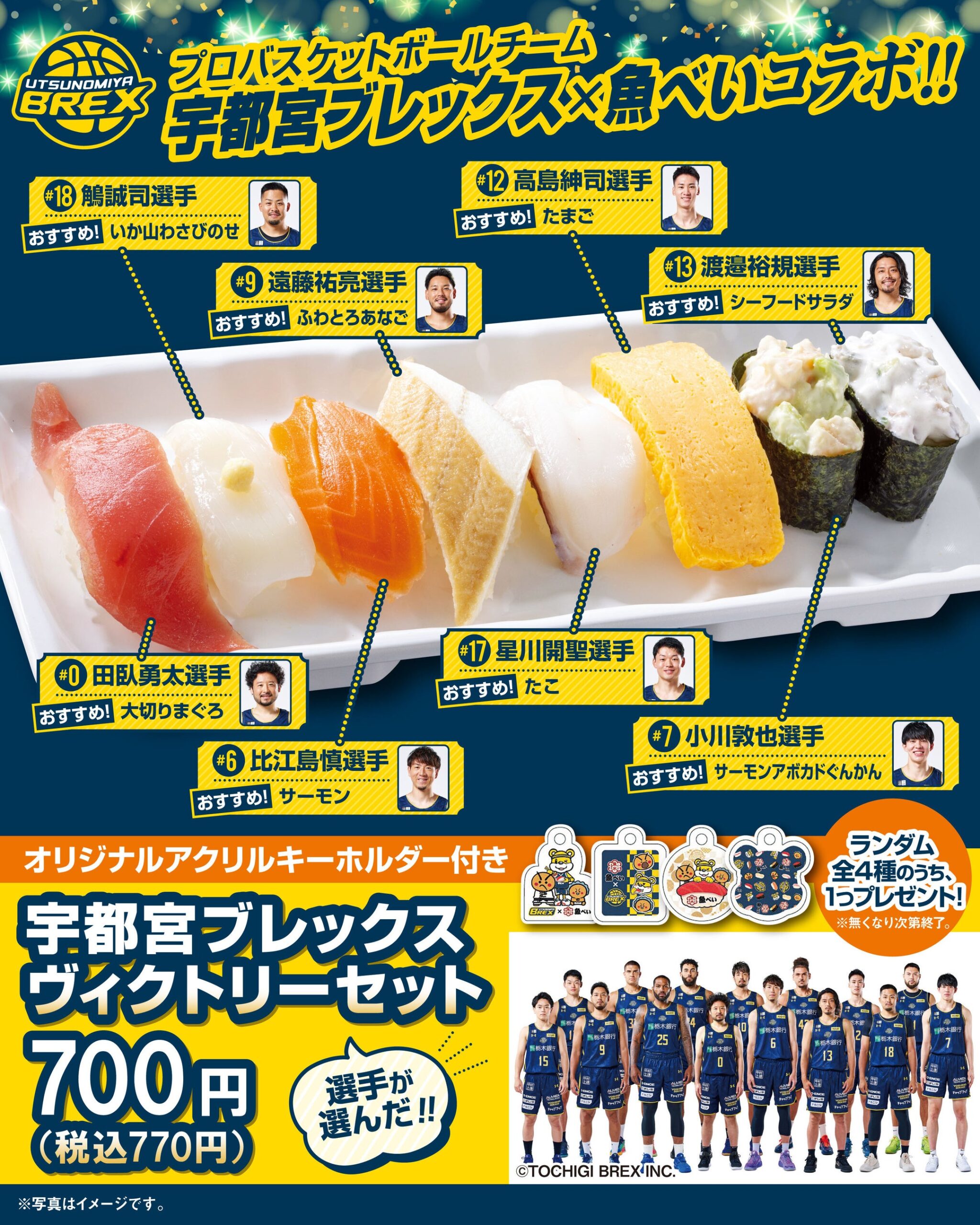 魚べい・元気寿司は2026年2月10日から、Bリーグの宇都宮ブレックスとコラボした限定商品「宇都宮ブレックス ヴィクトリーセット」を全国の魚べい全店舗・元気寿司全店舗で販売します。価格は700円(税込770円)で、購入者にはオリジナルアクリルキーホルダーをランダム1種プレゼントします。