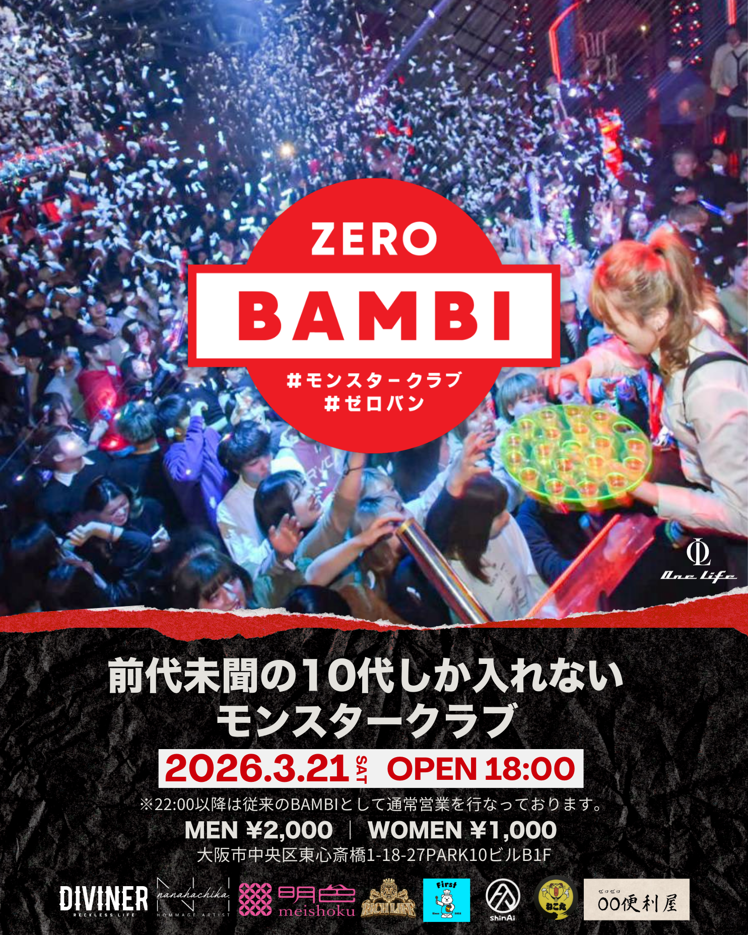 ナイトクラブ「BAMBI」とOne Lifeは、10代のみ入場可能とするクラブイベント「ZERO BAMBI」を大阪ミナミで始めます。初回営業は2026年3月21日18時〜21時で、入場料は男性2,000円(税込)、女性1,000円(税込)です。公式アンバサダーには、累計フォロワー数が100万人超のTikToker「みつきなんだよね」が就任しました。