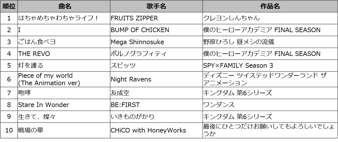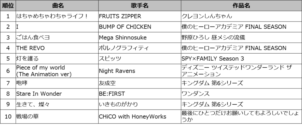 上位では、『僕のヒーローアカデミア FINAL SEASON』主題歌が2位(OP)と4位(ED)に入り、冨田氏はBUMP OF CHICKENやポルノグラフィティといった国民的人気アーティストの存在感が出たと述べています。5位は『SPY×FAMILY Season 3』OPのスピッツ「灯を護る」で、上位傾向からはジャンプ系を含む王道作品の強さも読み取れるとしています。3位は『野原ひろし 昼メシの流儀』OPのMega Shinnosuke「ごはん食べヨ」で、作品の話題に加え、洒脱で心地よいメロディが中高年層にも届いた可能性があるとの見方です。