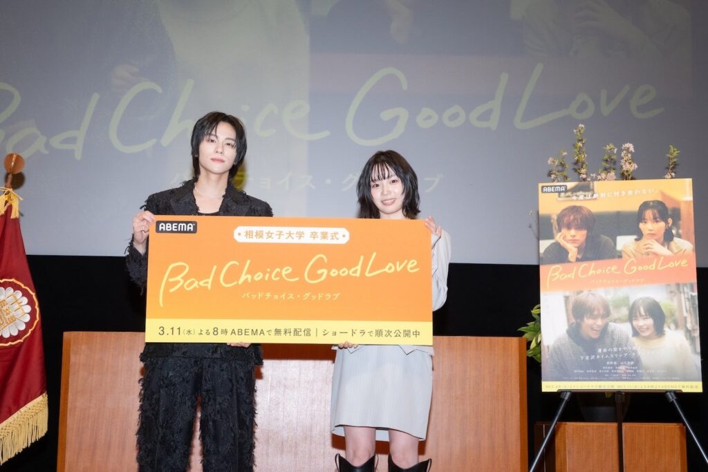 2026年3月6日、相模女子大学グリーンホールで行われた卒業式の閉式後、ABEMAとショードラの縦横連動ハイブリッドドラマ『バッドチョイス・グッドラブ』に出演する宮﨑優さんと山下幸輝さんがサプライズ登壇した。卒業式参加者は約1,400人で、会場は大きな反響に包まれた。