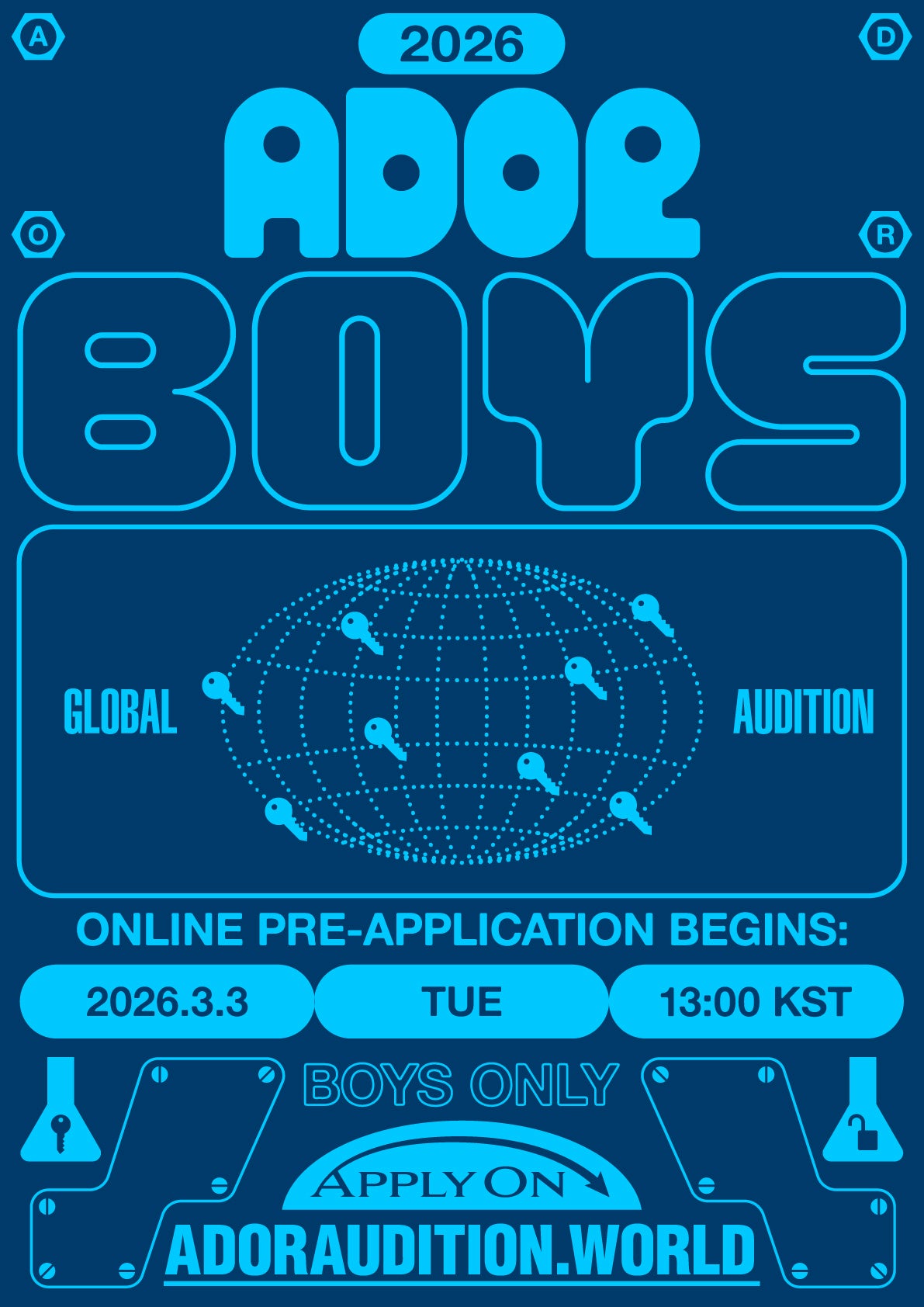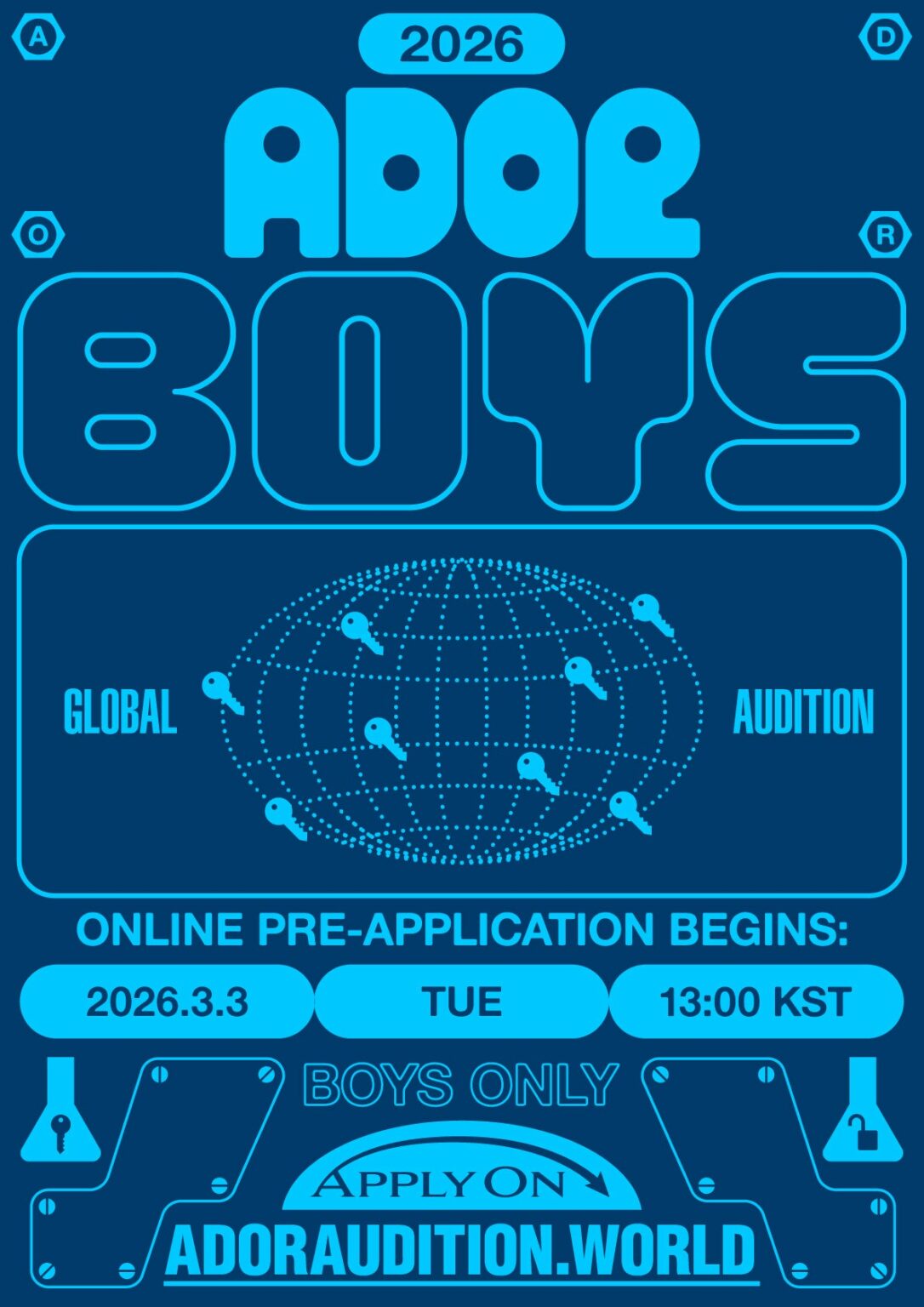 HYBE MUSIC GROUPのレーベルADORは、ボーイグループのメンバーを募る「2026 ADOR BOYS GLOBAL AUDITION」を2026年3月21日から4月19日まで実施します。対面オーディションは世界11都市で行い、応募資格は2007年以降に生まれた男性です。