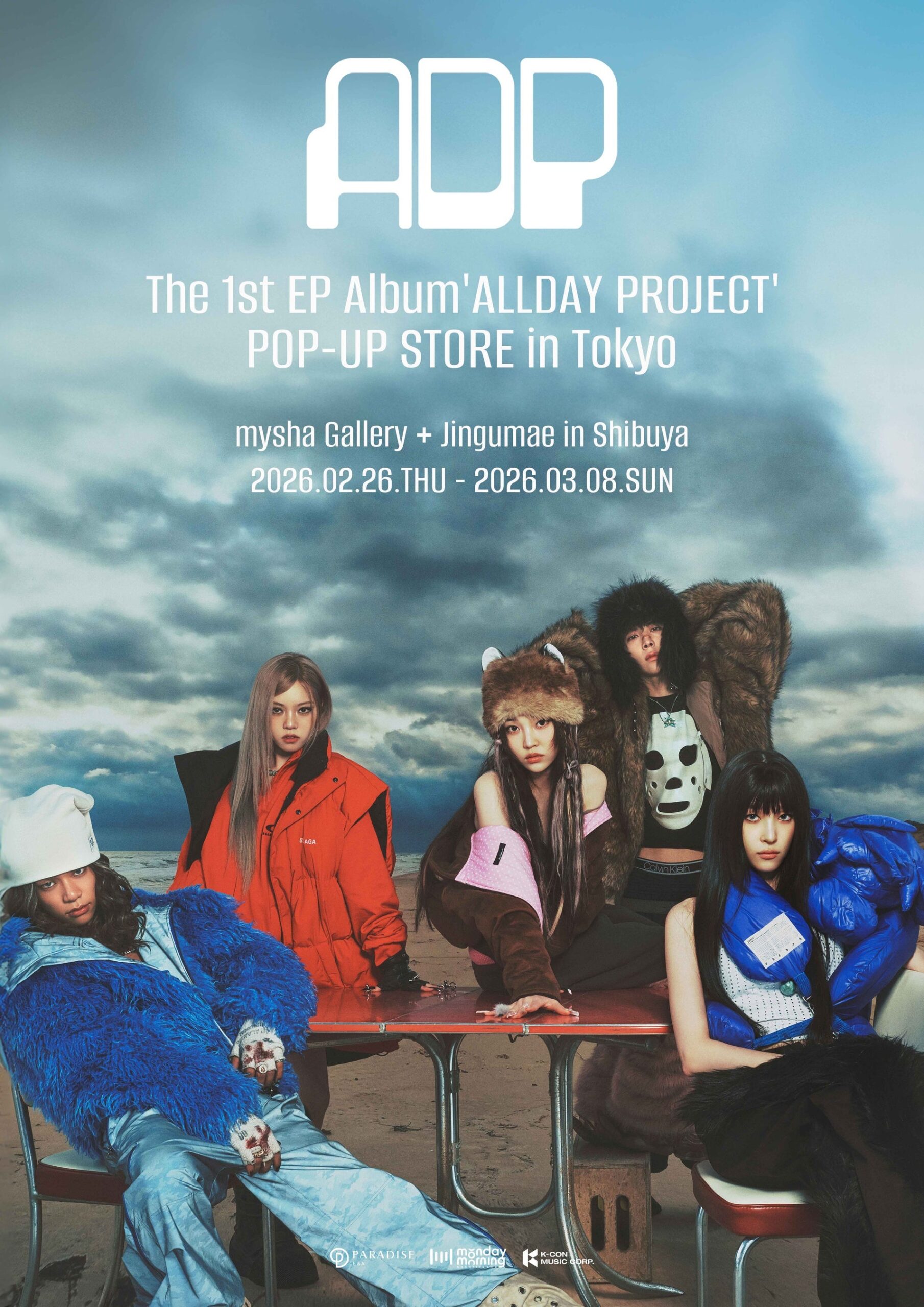 FG ENTERTAINMENTは、5人組の男女混合アイドルグループ「ALLDAY PROJECT」の1st EP「ALLDAY PROJECT」リリースを記念し、東京・神宮前のmysha GalleryでPOP-UP STOREを開く。期間は2026年2月26日〜3月8日で、初日は16:00〜20:00、2月27日以降は10:00〜20:00の営業とする。