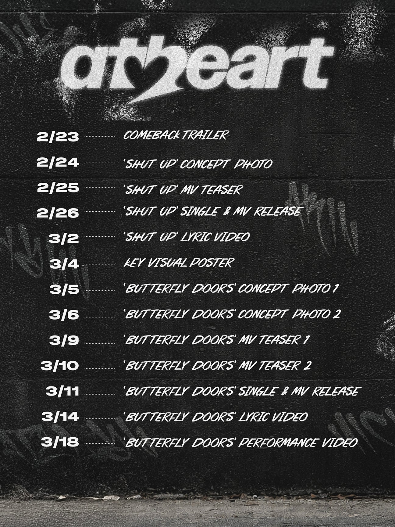 AtHeart(エトハート)は2026年2月23日7時、公式SNSでカムバックスケジューラーを公開し、デジタルシングル『Shut Up』を2月26日18時、『Butterfly Doors』を3月11日18時に順次リリースすると明らかにしました。配信は世界中の音楽プラットフォームで行う予定です。