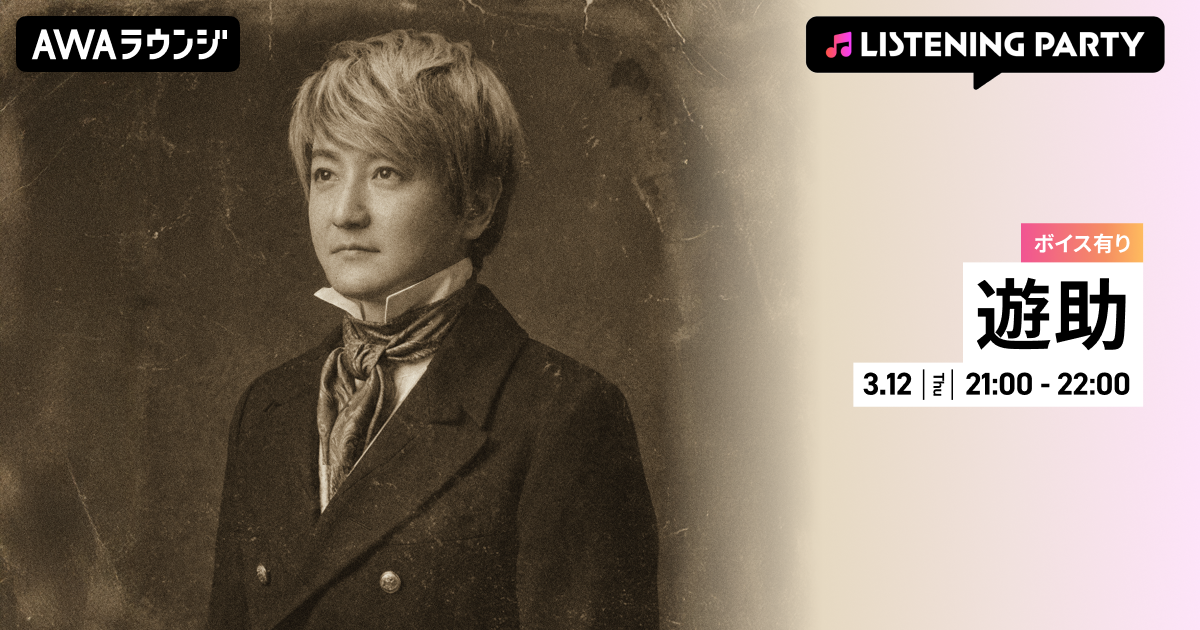 AWAは、遊助の16th ALBUM『遊助世代』のリリースを記念し、遊助特集のリスニングパーティーを2026年3月12日(木)21:00~22:00にオンライン空間「AWAラウンジ」で実施します。AWA限定ボイストラックのオンエアも予定しています。