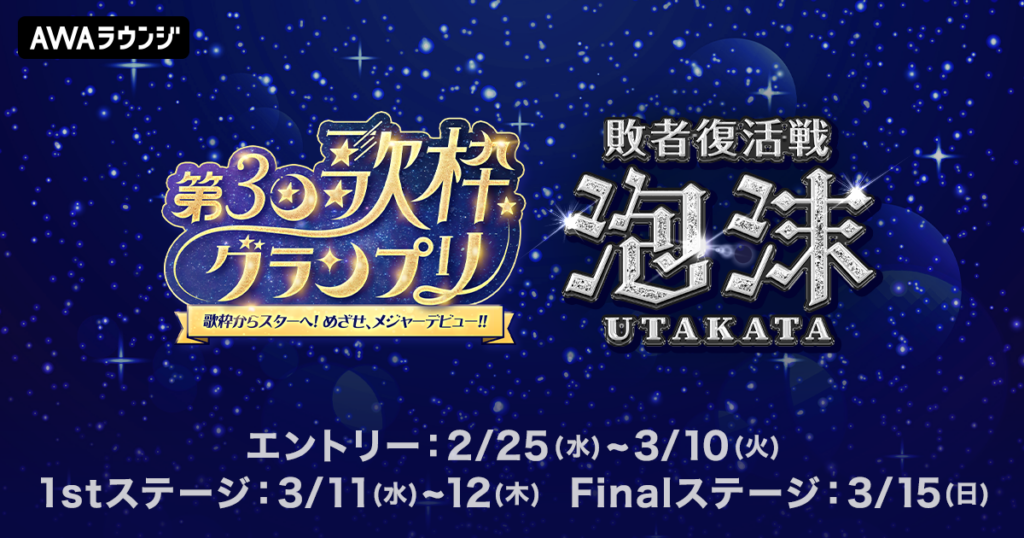 AWAは2026年2月2日、V-tamp主催のオーディション企画『第3回 歌枠グランプリ』の敗者復活戦サイドイベント「泡沫(ウタカタ)」を、音楽ストリーミングサービス「AWA」上で開催するとした。対象は同企画に参加し予選を通過できなかった配信者で、AWAでの配信を通じて勝ち上がった1名が決勝戦への出場権を得る。