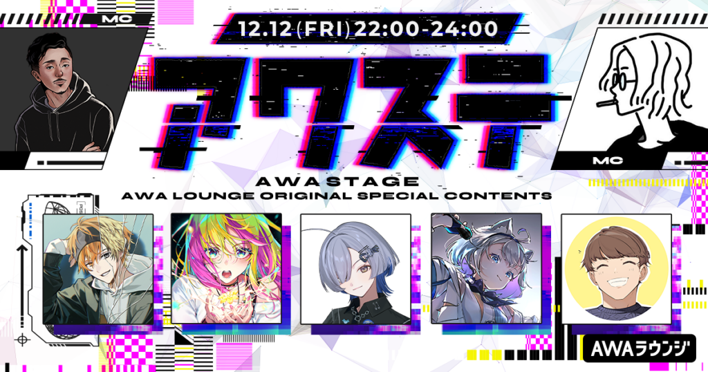 音楽ストリーミングサービス「AWA」が、2025年12月12日(金)22時~24時に生配信番組「AWAステージ(アワステ)」第65回を実施します。オンライン空間「AWAラウンジ」で無料開催され、ネットカルチャーの有識者5組とMC陣2人の計7人が、2025年の音楽シーンを振り返ります。