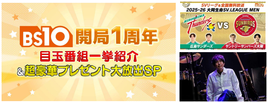 全国無料のBS放送局「BS10(ビーエステン)」は、2026年1月10日(土)に開局1周年を迎え、同日にスポーツ中継や音楽ライブ、生放送番組を組んだ1日特別編成を放送します。柱となるのは、プロ男子バレーボール「大同生命SV.LEAGUE」広島サンダーズ対サントリーサンバーズ大阪の全国無料生中継で、13時50分からインタビュー、13時55分から試合を届けます。実況は田中大貴アナ、解説は元日本代表の佐々木太一さんです。中継では両チーム計4選手のサイン入りユニフォームを抽選でプレゼントし、応募方法は放送内で案内します。視聴者参加として、無料公式アプリ「つながるジャパネット」で応援コメントを募り中継内で紹介予定ですが、試合の同時配信は行わず視聴はBS放送に限ります。続いて17時からは佐藤竹善さんのライブ映像「LIVE With The Cornerstones ’22」を無料放送し、2022年10月9日のLINE CUBE SHIBUYA公演をMC込みで放送します。夜は19時30分から生放送「BS10 プレミアムNAVI」にミッツ・マングローブさんが出演し、有料チャンネル「BS10プレミアム」の見どころを紹介します。20時からは生放送特番「BS10開局1周年!2026目玉番組大紹介&超豪華プレゼント大放出スペシャル!」を編成し、田中大貴アナ、鈴木隆行さん、児嶋一哉さんが出演します。番組では「B.LEAGUE ALL-STAR GAME WEEKEND 2026 IN NAGASAKI」(1月17日放送予定)に先立つ解説や、ベルギー1部シント=トロイデンVVの日本人選手特集、「麻雀オールスターBS10チャンピオンシップ」新シーズン(1月21日開始)紹介などを予定し、アプリとXを連動した投稿でプレゼント応募を受け付けます。無料放送にライブ映像と有料チャンネルの案内を組み合わせる点から、既存視聴者の満足度向上に加え新規視聴の入り口づくりも狙う構成とみられ、当日の反響が今後の編成や施策に影響する可能性があります。