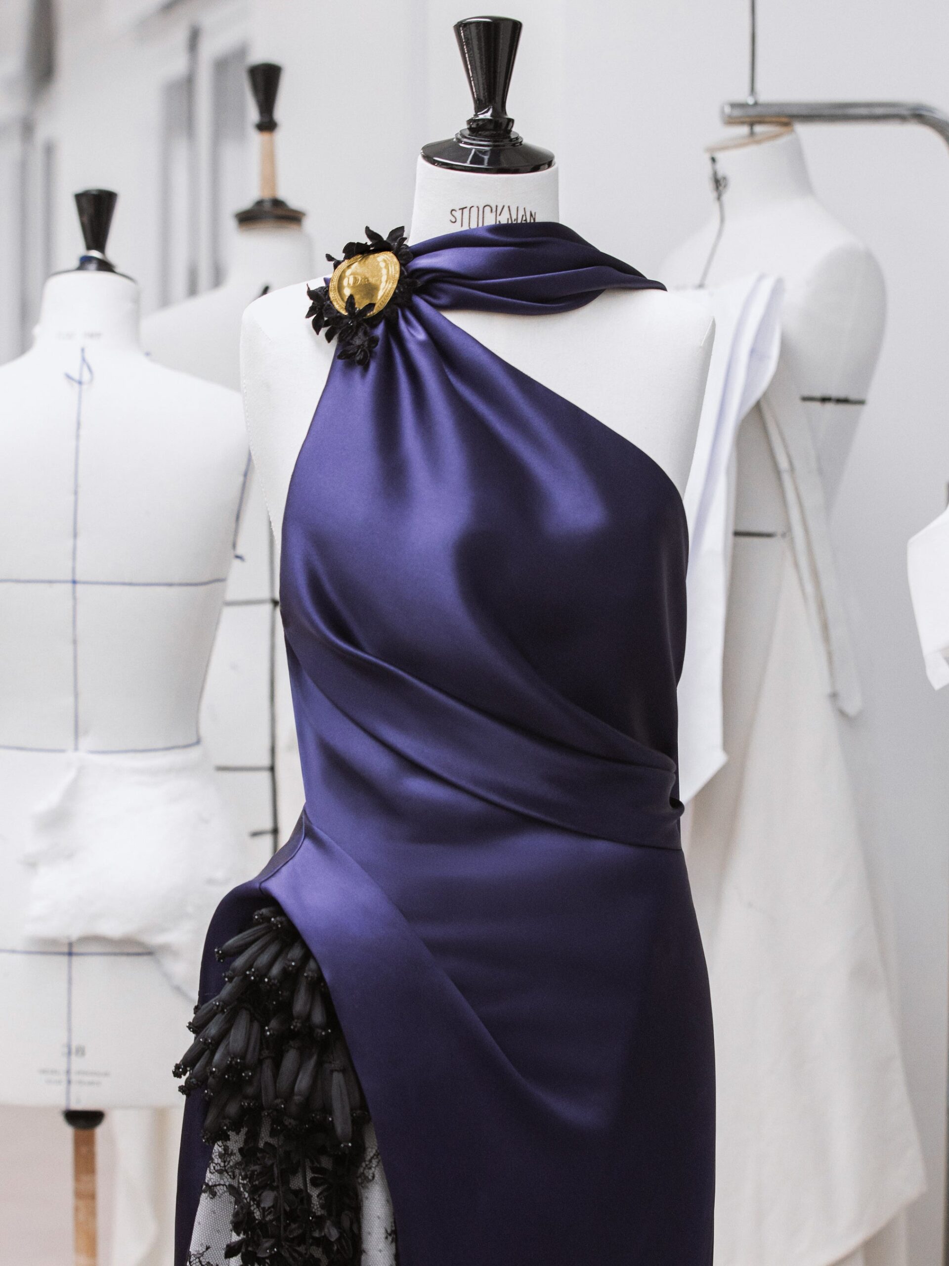 ドレスはジョナサン・アンダーソンが手がけた「ブラックのレースとチュールをあしらったインディゴサテンドレス」です。花房の刺繍に加え、ディオールの「メダリオン」ブローチで装飾し、素材の重なりや刺繍の立体感など、写真を通じてディテールを可視化します。