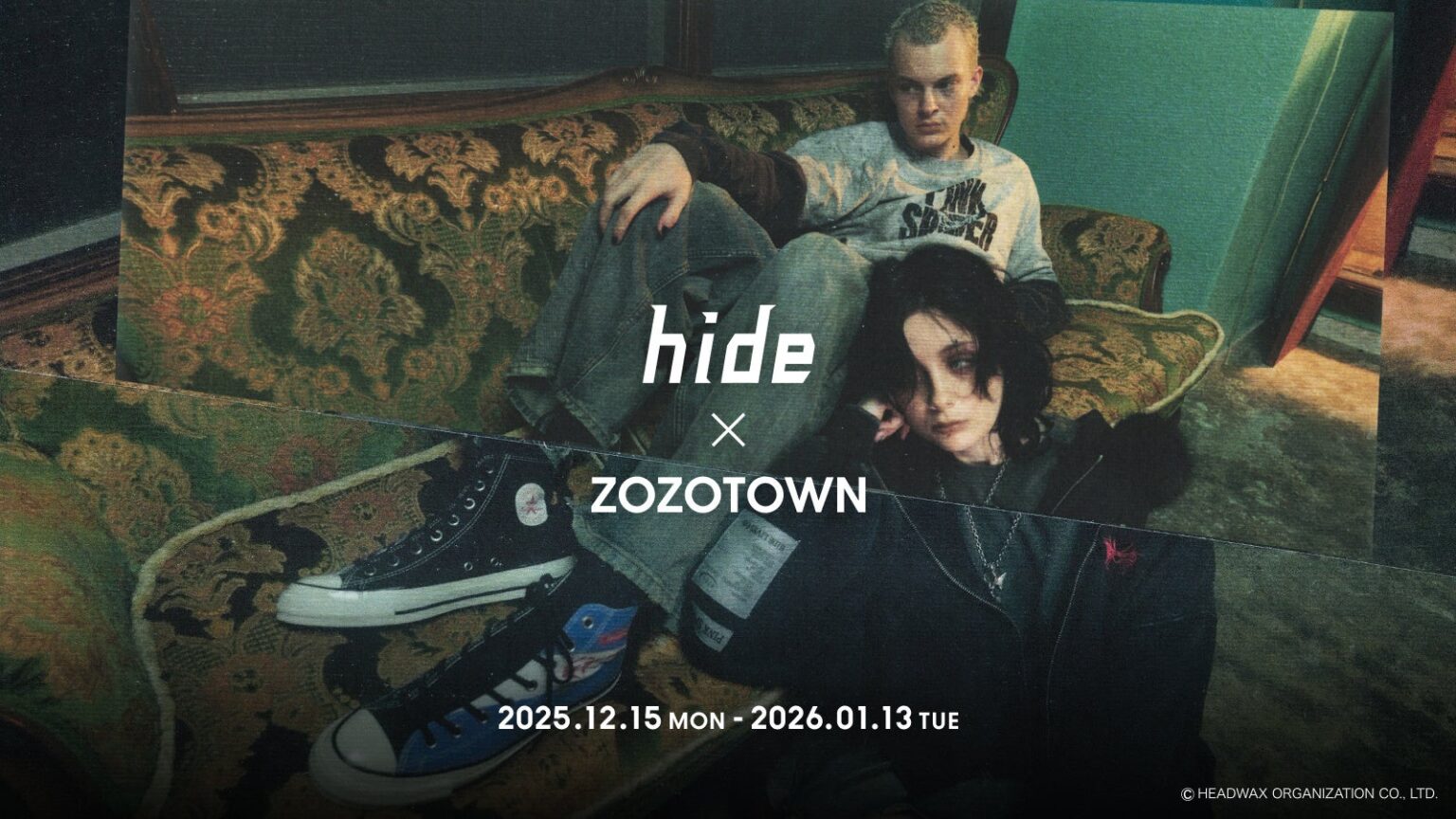 オンラインファッションモール「ZOZOTOWN」は12月15日正午から、ロックアーティスト・hideさんとのコラボアイテム全10型を同サイト限定で受注販売します。販売期間は2026年1月13日11時59分までで、価格はスニーカー22,000円(税込)、Tシャツ9,350円(税込)などです。お届け時期は2026年3月下旬〜9月中旬の予定です。