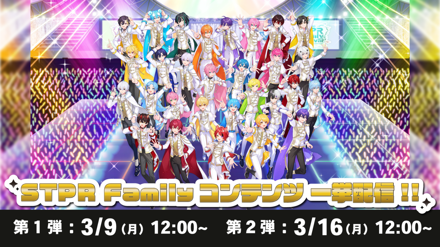 配信開始を記念し、3月限定で毎週木~日曜に無料ライブ配信も行う。開始は木曜枠が3月12日17時30分からで、金曜は「STPR Family Festival!! DAY4」、土日はバーチャル公演を配信する予定です。