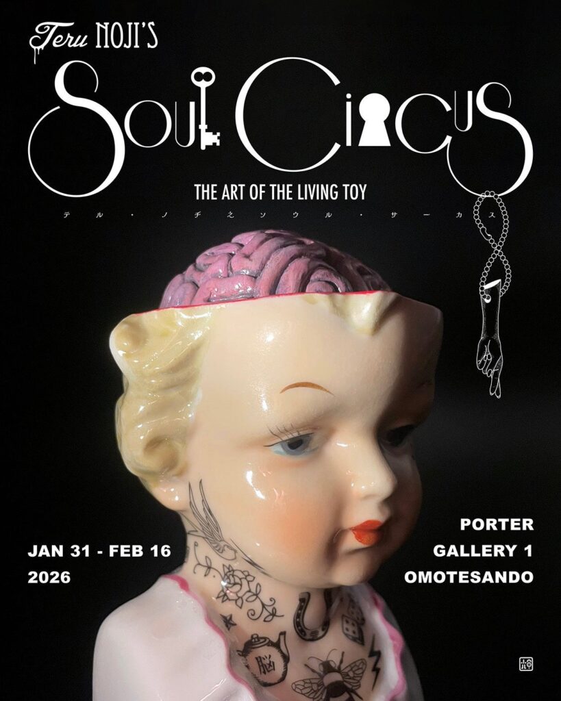 PORTER OMOTESANDO(東京都渋谷区)は2026年1月31日〜2月16日、館内のthe PORTER Gallery 1で「Teru Noji in the PORTER Gallery 1」展を開き、ドール作品や立体作品などを展示・販売します。営業時間は12:00〜20:00で、販売価格帯は8万〜26万円(税込)です。