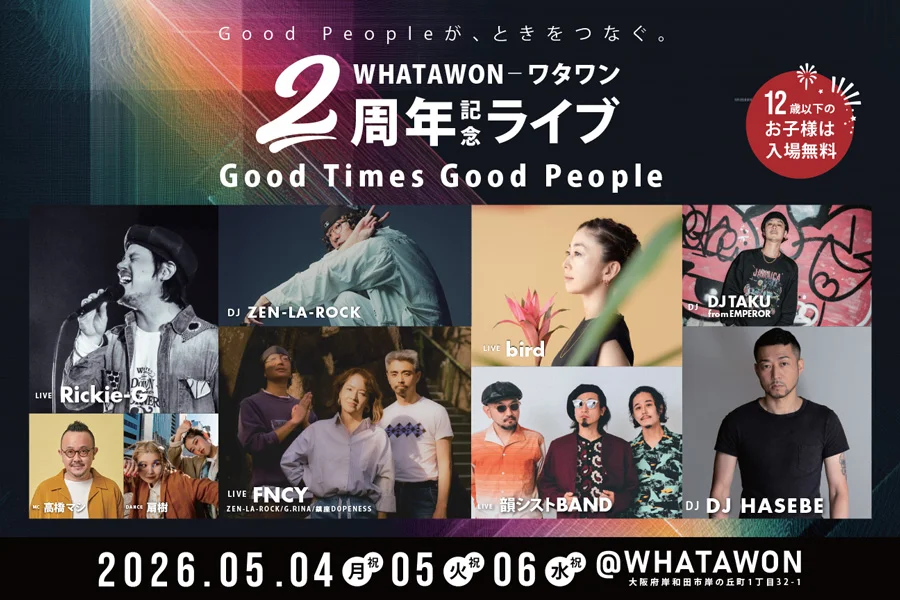 大阪府岸和田市の滞在型エンターテインメントモール「WHATAWON(ワタワン)」は、開業2周年を記念した3日間フェス「Good Times Good People」を2026年5月4日〜6日に開催し、3日間通しチケット(13,000円)の販売を始めました。会場は館内の「Floor Disco Ball」で、12歳以下は入場無料です。
