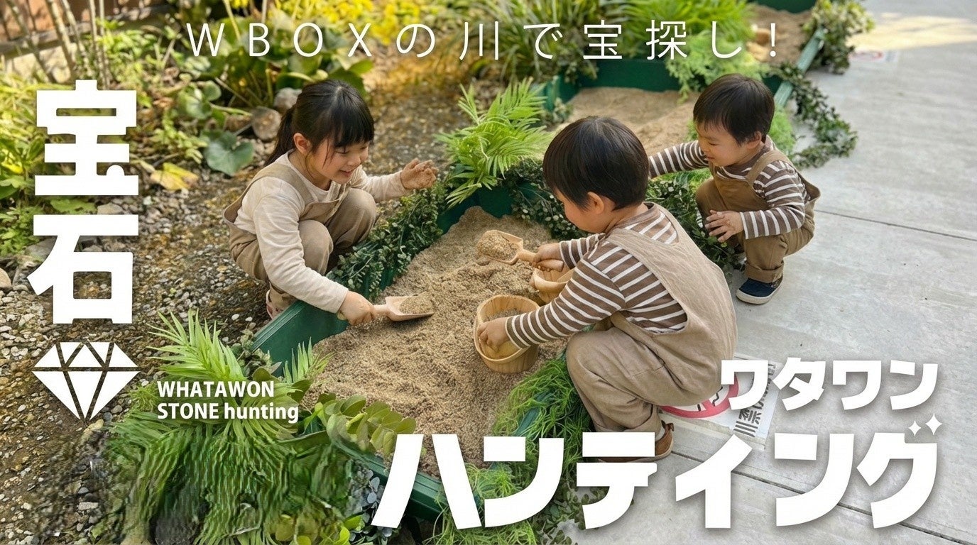 大阪府岸和田市の滞在型エンターテインメントモール「WHATAWON(ワタワン)」は、砂の中から天然石などを探して持ち帰れる子ども向け体験イベント「宝探しゲーム」をWBOX内(川沿い)で実施しています。時間は10時30分〜17時05分で、15分ごとの交代制です。料金は1回800円です。