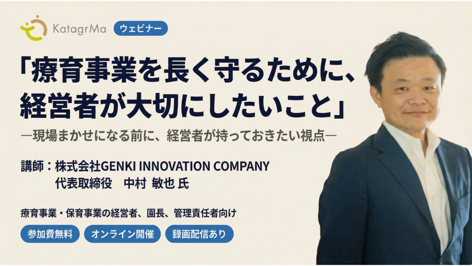 療育事業の経営者向けに、カタグルマ(東京都千代田区)は3月19日、オンラインの無料ウェビナーを開く。時間は①10:00~11:00、②18:00~19:00の2枠で同内容。講師はGENKI INNOVATION COMPANY代表の中村敏也氏で、福祉事業所29施設の運営経験を持つという。