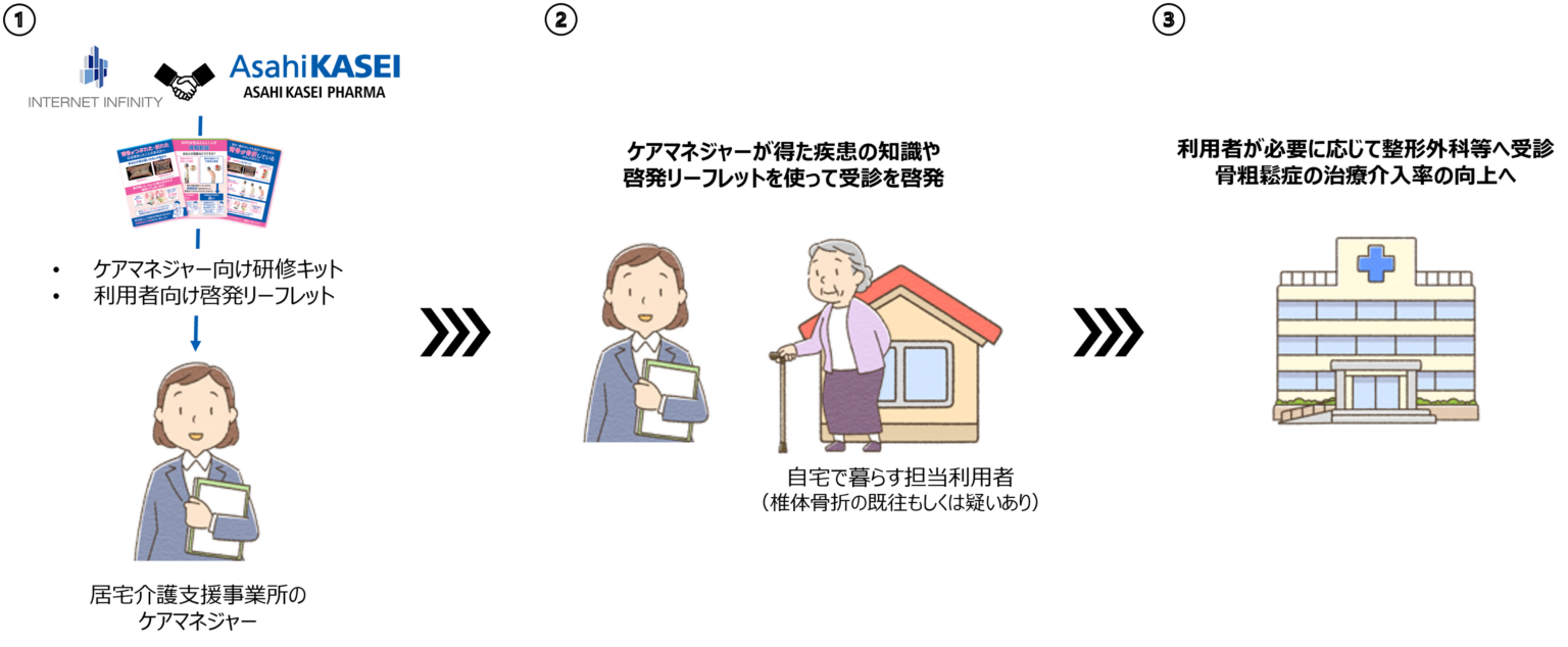 両社は研修キットやリーフレットなどの資材を居宅介護支援事業所へ提供し、ケアマネジャーが利用者・家族に情報提供して必要に応じ整形外科などの受診を促した。骨粗鬆症は骨の強度が低下し骨折しやすくなる疾患で、高齢者では未治療や治療中断が課題とされる。