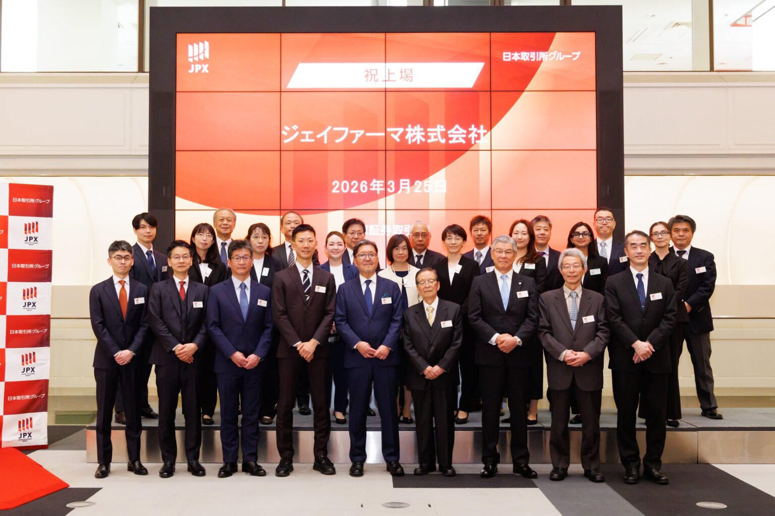 ジェイファーマ(本社:東京都港区)は2026年3月25日、東京証券取引所グロース市場へ新規上場した。証券コードは520Aで、同日15時39分に上場と研究開発プログラム(LAT1阻害剤)の進捗を示した。