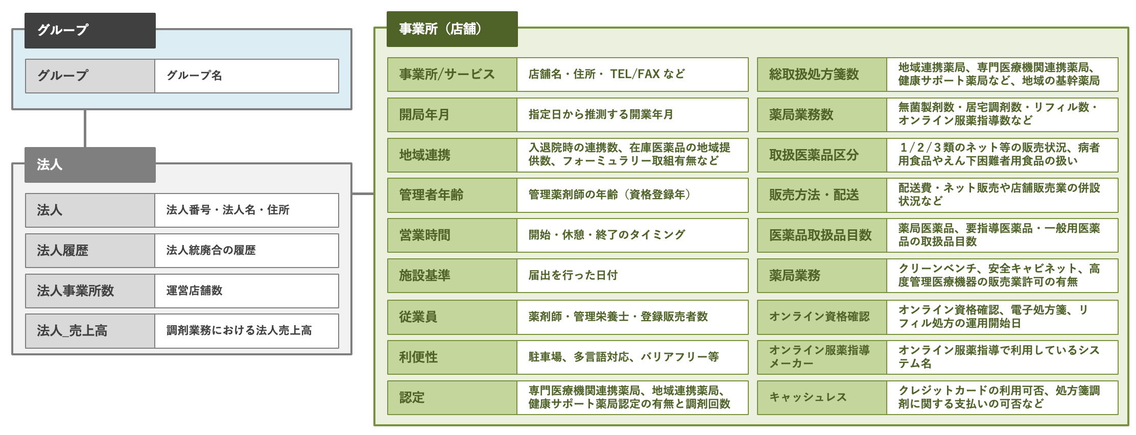立地は医療機関と薬局の緯度経度データを基に、医療モール型・門前型・敷地内型・マンツーマン型に分類します。近隣医療機関の病床規模、診療科構成、外来患者数、距離なども含め、法人・立地・応需医療機関や応需診療科(推定)を横断して分析できる設計です。