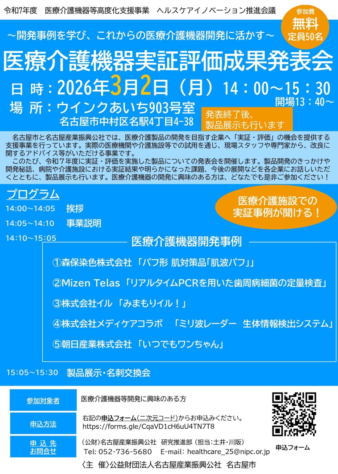 名古屋市と(公財)名古屋産業振興公社は2026年3月2日14時から、介護現場での試用・評価で見えた製品課題と改良方針を共有する「医療介護機器等高度化支援事業」成果発表会をウインクあいち(名古屋市中村区)で開きます。発表企業は5社で、参加費は無料、定員は50人です。