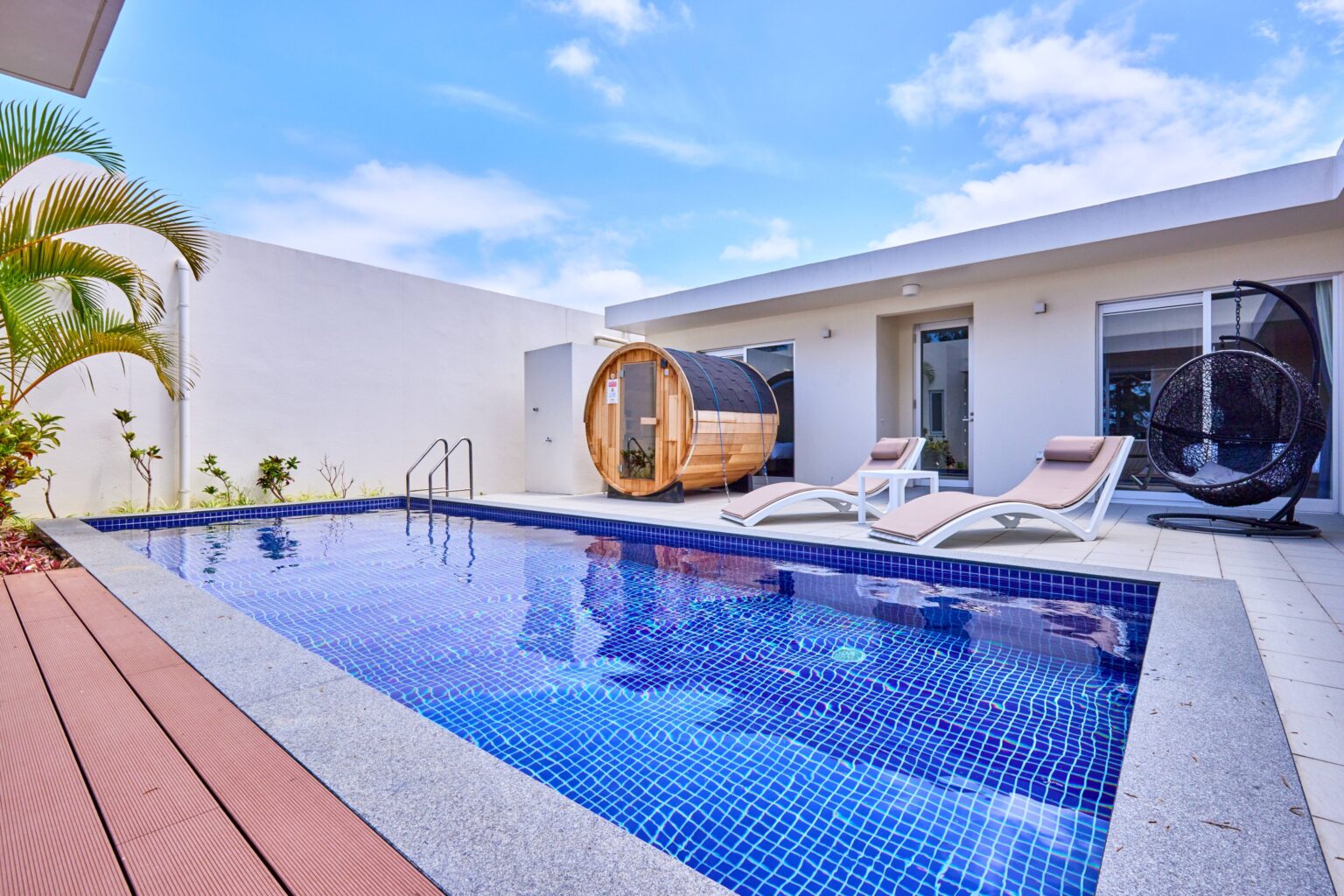 沖縄県国頭郡本部町新里の「The Pool & Sauna Villa MOTOBU」は、7棟すべての客室にバレルサウナを導入し、プライベートプールと組み合わせた滞在体験を提供します。最大8名まで宿泊でき、敷地面積は1棟あたり160㎡です。