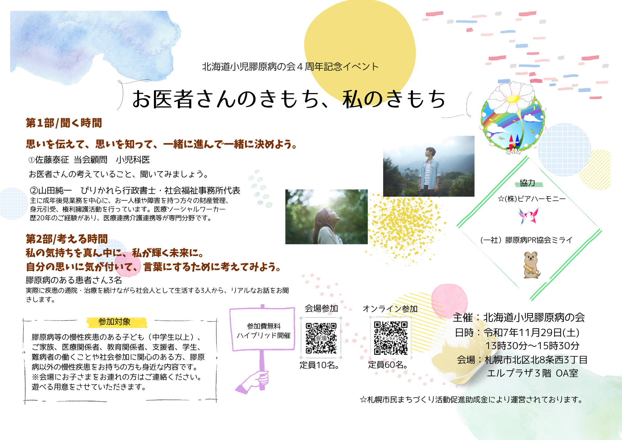 北海道小児膠原病の会は11月29日、設立4周年の記念イベント「お医者さんのきもち、わたしのきもち」を札幌エルプラザとオンラインの両方で開きました。事前アンケートでは、医療現場のコミュニケーションの難しさが5段階平均で4とされ、認識のズレが課題として示されていました。