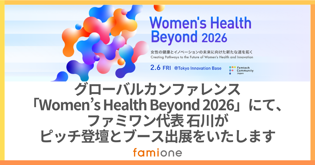 女性の健康領域のグローバルカンファレンス「Women’s Health Beyond 2026」が2026年2月6日10時〜19時、Tokyo Innovation Base(東京・丸の内)で開かれ、ヘルスケア支援サービス「ファミワン」を展開するファミワンの石川勇介氏がピッチに登壇し、ブースも出展します。参加費は無料で、参加者は約300人を想定しています。主催は一般社団法人Femtech Community Japanで、東京都のスタートアップ支援事業「TOKYO SUTEAM」の一環として、PwCコンサルティング合同会社が協力します。プログラムはセッション、ピッチ、ブース展示の3部構成で、ピッチは「事業アイデア」「ディープテック」「オープンイノベーション」の3カテゴリーです。ブースでは看護師や心理士、培養士など専門家が関わるオンライン相談型の支援内容に加え、検査キットや自治体・企業との協業事例を紹介します。会場開催を軸にしつつ、一部は遠隔会場と連携したリアルタイム配信も予定され、今後は参加企業・団体間の連携具体化が焦点になります。