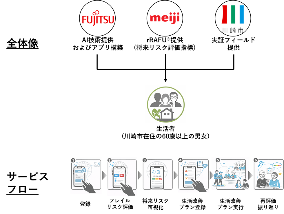 富士通と明治は、将来の低栄養・フレイルリスクを評価する指標「rRAFU®」を組み込んだセルフケア支援アプリを用い、川崎市で社会実装に向けた実証実験を2026年2月から6月まで(予定)行います。対象は川崎市在住の60歳以上で、募集人数は約240名です。