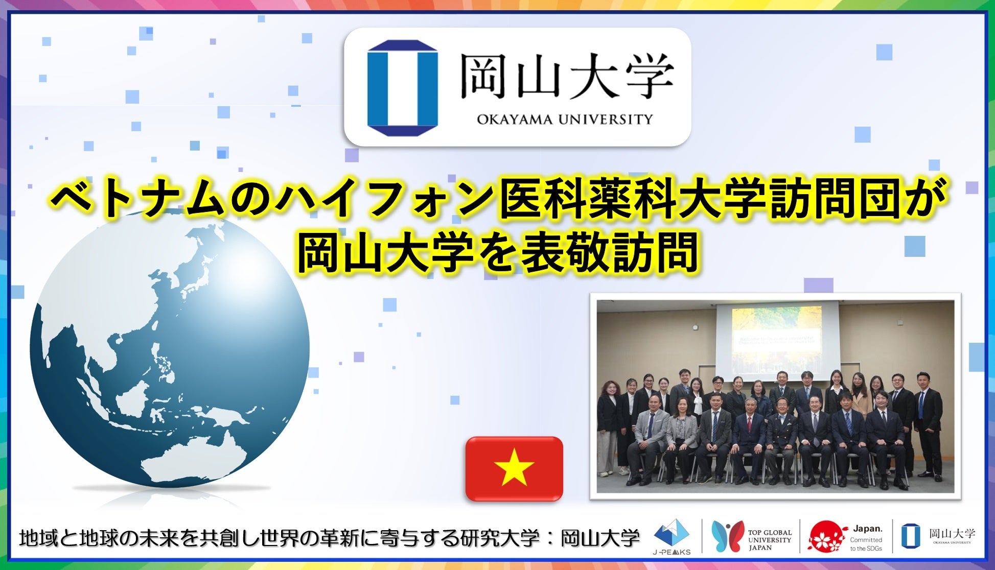 2026年4月16日、ベトナムのハイフォン医科薬科大学(学長NGUYEN Van Khai=グエン・バン・カイ)訪問団が岡山大学(岡山市北区)を訪れ、那須保友学長を表敬訪問しました。学内では教職員に加え、岡山大学で学ぶベトナム人留学生12人も出席しました。