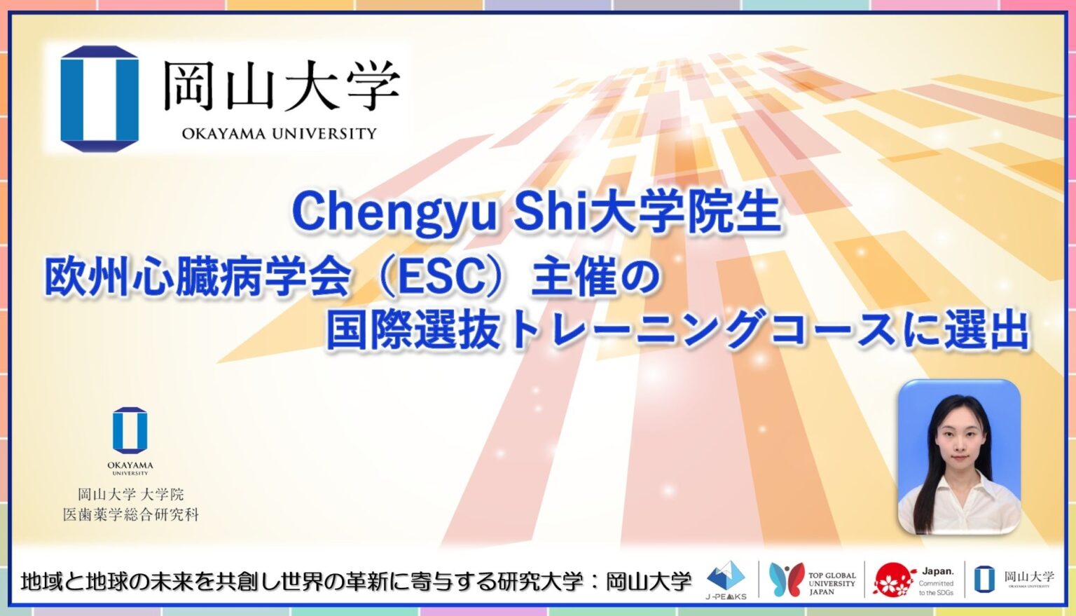 岡山大学は2026年5月1日、大学院医歯薬学総合研究科博士課程の石成玉(Chengyu Shi)さんが、欧州心臓病学会(ESC)主催の国際選抜トレーニング「ESC Fund Basic Cardiovascular Science Course 2026」の受講者に選ばれたと明らかにしました。開催地はフランス・ニースで、受講者は世界から最大50人が選抜されます。