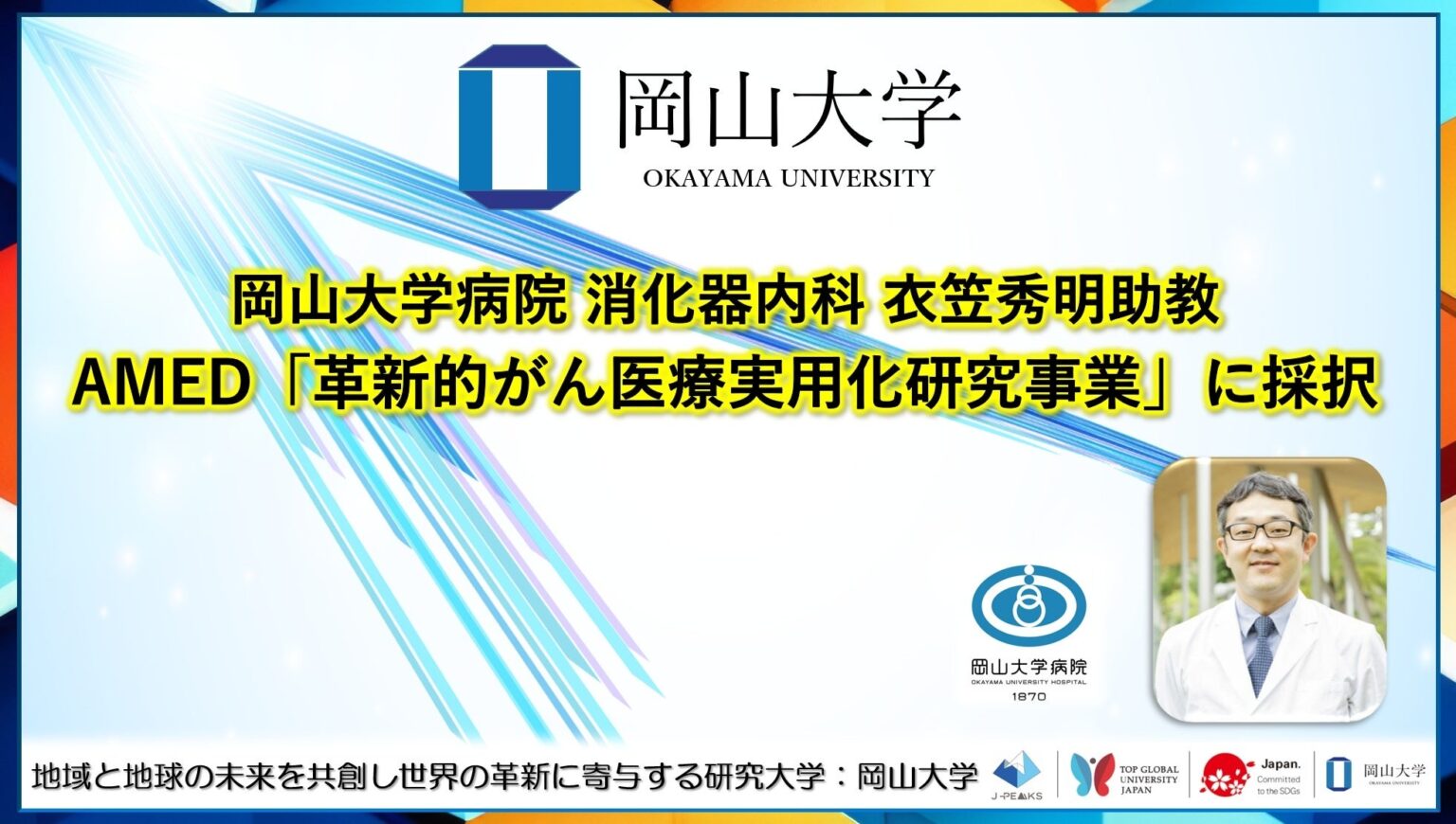 岡山大学病院(岡山市北区)消化器内科の衣笠秀明助教が、AMEDの「令和8年度革新的がん医療実用化研究事業」に研究課題「深層生成モデルによるVirtual Chromoendoscopyの臨床的代替性に関する研究開発」で採択されました。研究期間は令和8~10年度の3年間です。